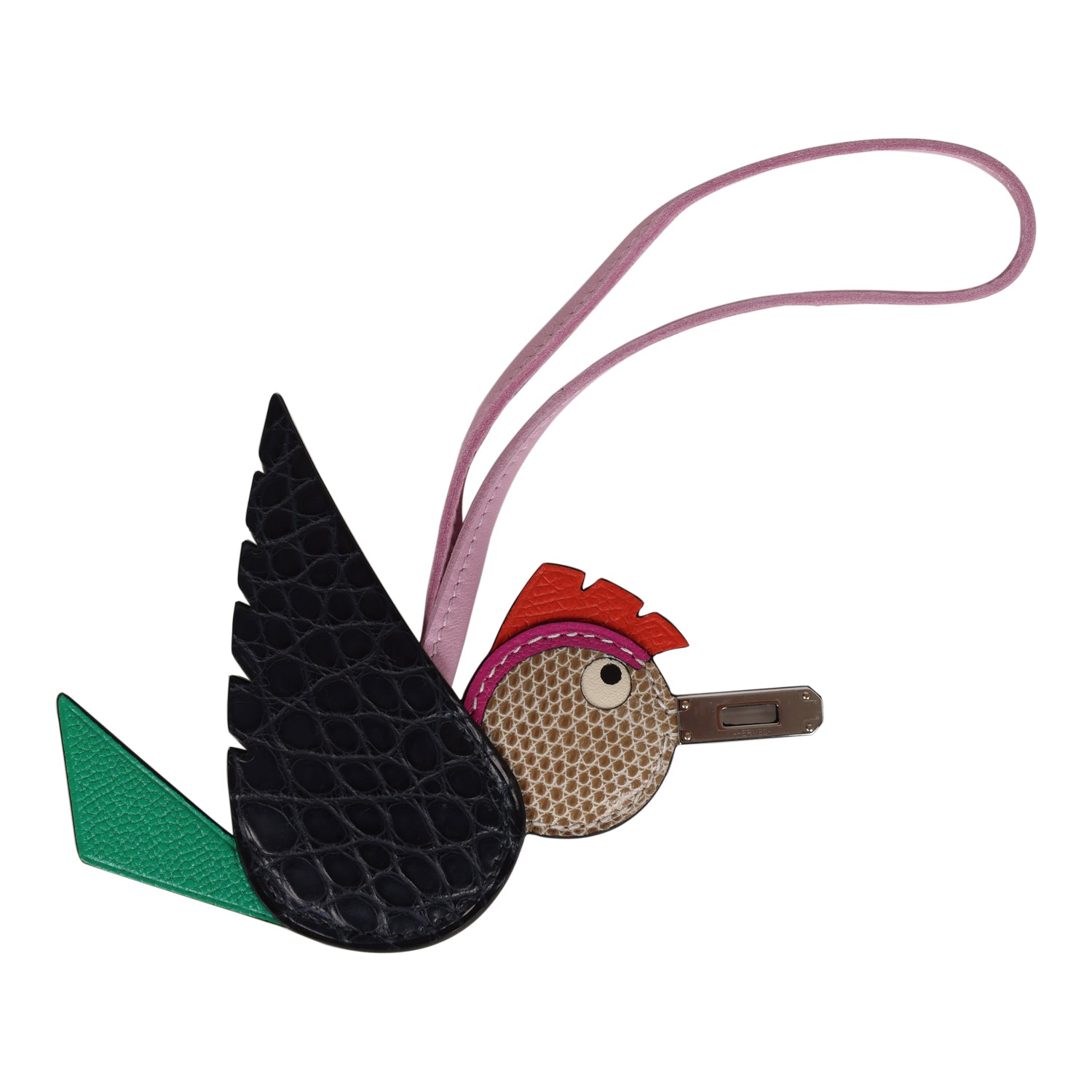 This Birdy bag charm is in Bleu Marine Matte Alligator, Etoupe Lizard, and is accented by a palladium hardware beak.