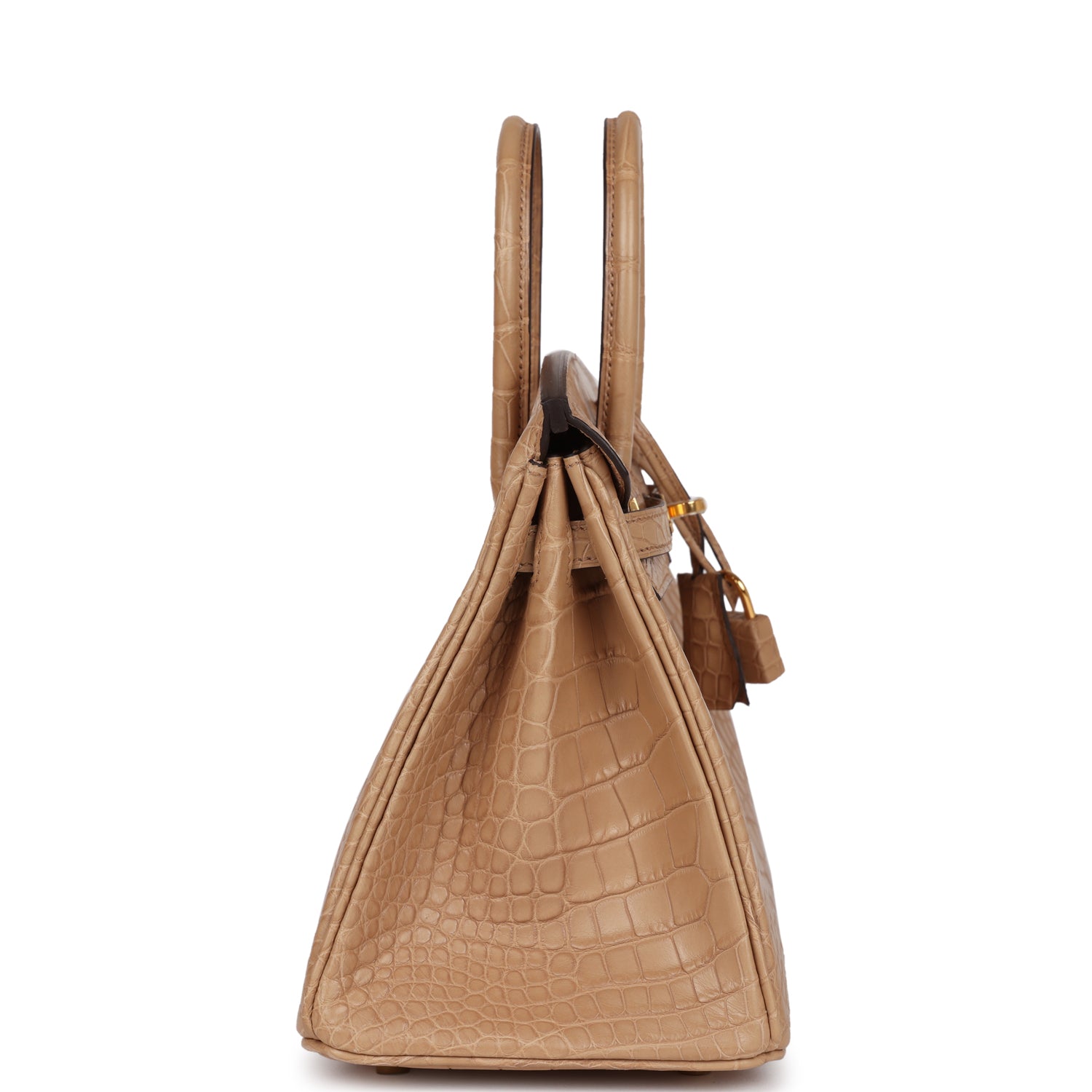 This Birkin 25 is in Chai Mississippiensis Matte Alligator leather with gold hardware, tonal stitching, front flap with two straps, front toggle closure, clochette with lock and two keys, and double rolled handles.