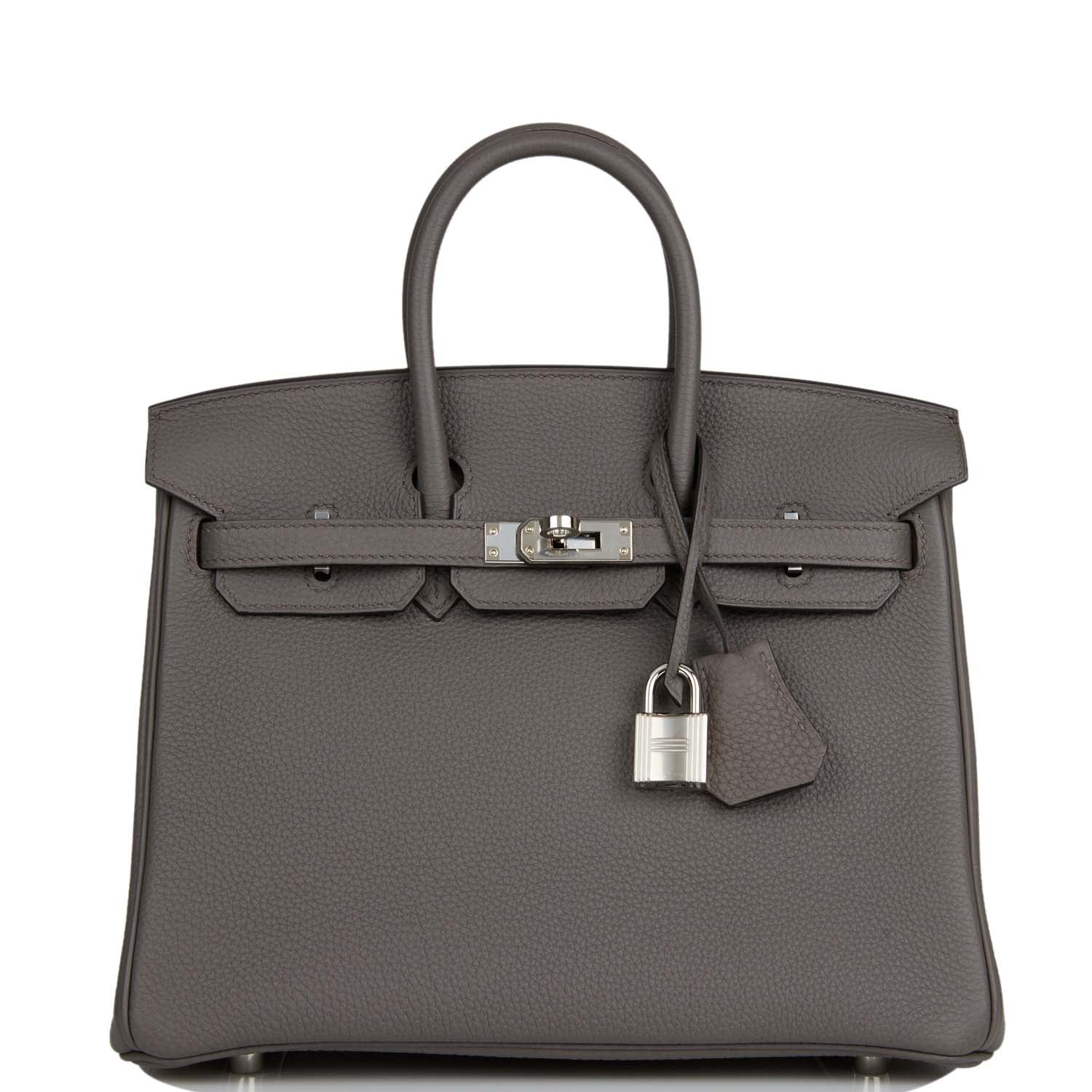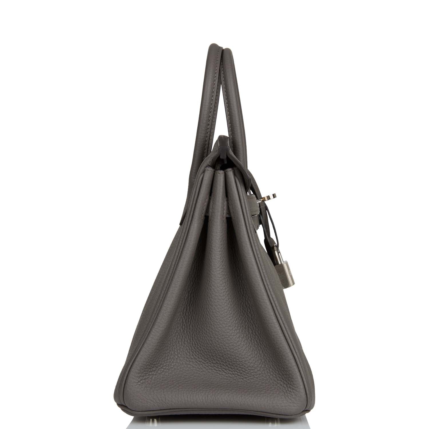 This Birkin is in Etain togo leather with palladium hardware and has tonal stitching, two straps with front toggle closure, clochette with lock and two keys and double rolled handles.
