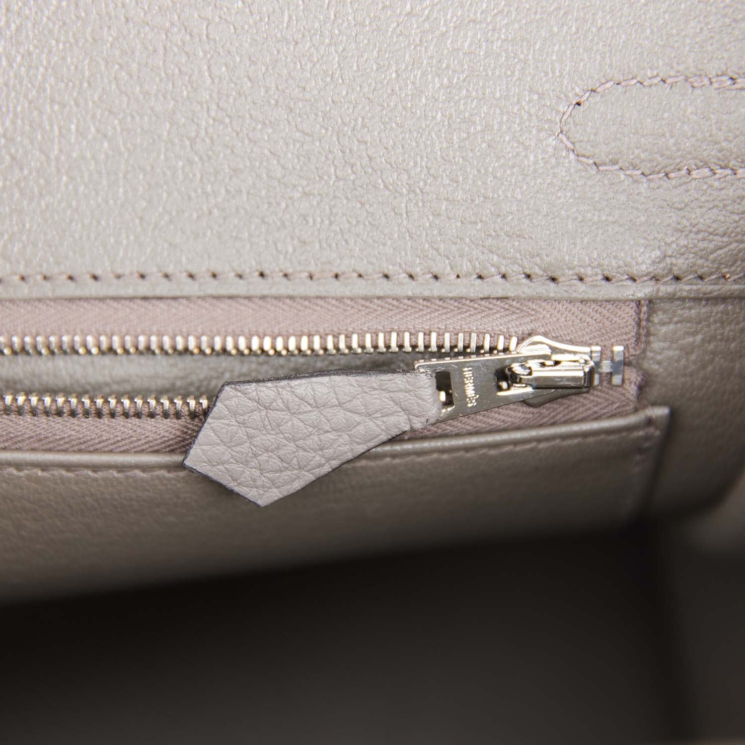 The interior is lined with Etain chevre and has one zip pocket with an Hermes engraved zipper pull and an open pocket on the opposite side.