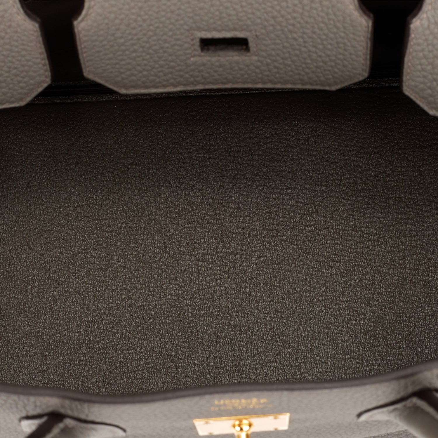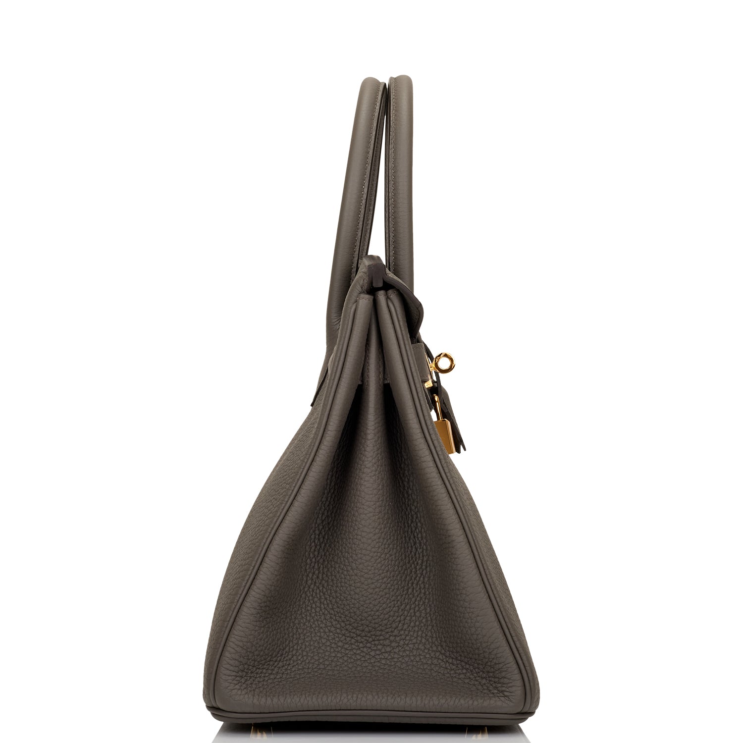 This Birkin is in Etain togo leather with gold hardware and has tonal stitching, front flap, two straps with center toggle closure, clochette with lock and two keys, and double rolled handles.