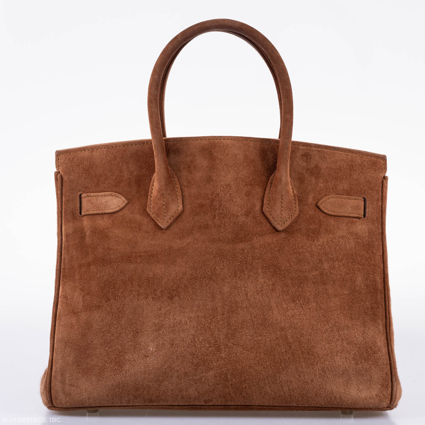 Some Birkins are rare on a level that goes far and beyond the rest. This super collectible grail bag is a 30cm Birkin made of a very unusual material for Hermès: Suede. Saying suede Birkins are rare is an understatement. They have been produced for as long as any Birkins have, though are more difficult to find than even a Himalayan. Veau Doblis suede as Hermès calls it, is treated as a precious material and given heightened attention towards quality and construction. This extremely rare collectors piece is at once unbelievably unique, and a timeless classic, rendered in one of Hermès’ most enduring neutral shades: Fauve - the tone given to its deeply loved Barenia leather, reimagined here in precious suede. It has been kept in immaculate condition with the plastic intact on the Palladium hardware, and is ready to sit at the top of a world-class collection.