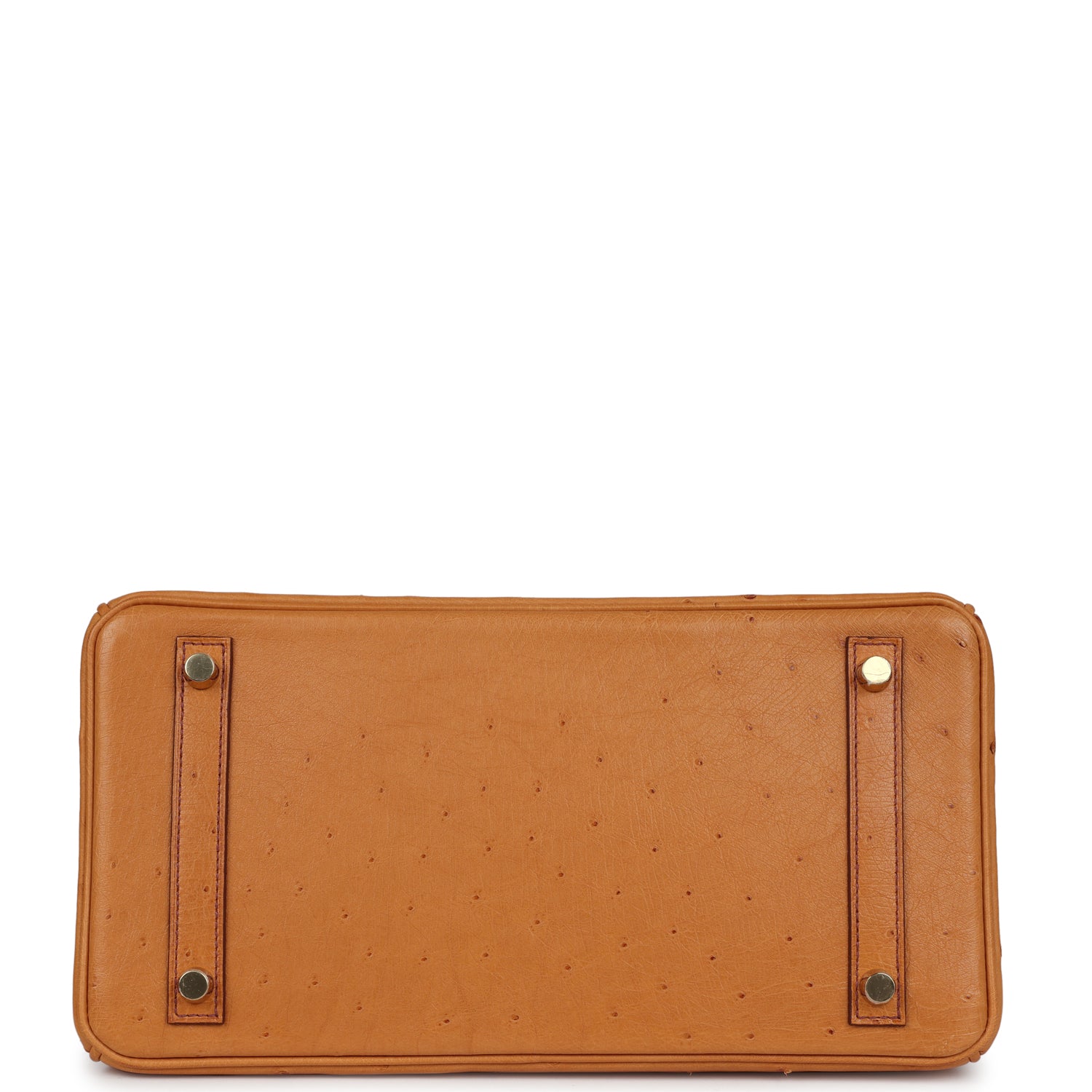 This Birkin is in gold ostrich with gold hardware and features tonal stitching, front flap, two straps with center toggle closure, clochette with lock and two keys, and double rolled handles.