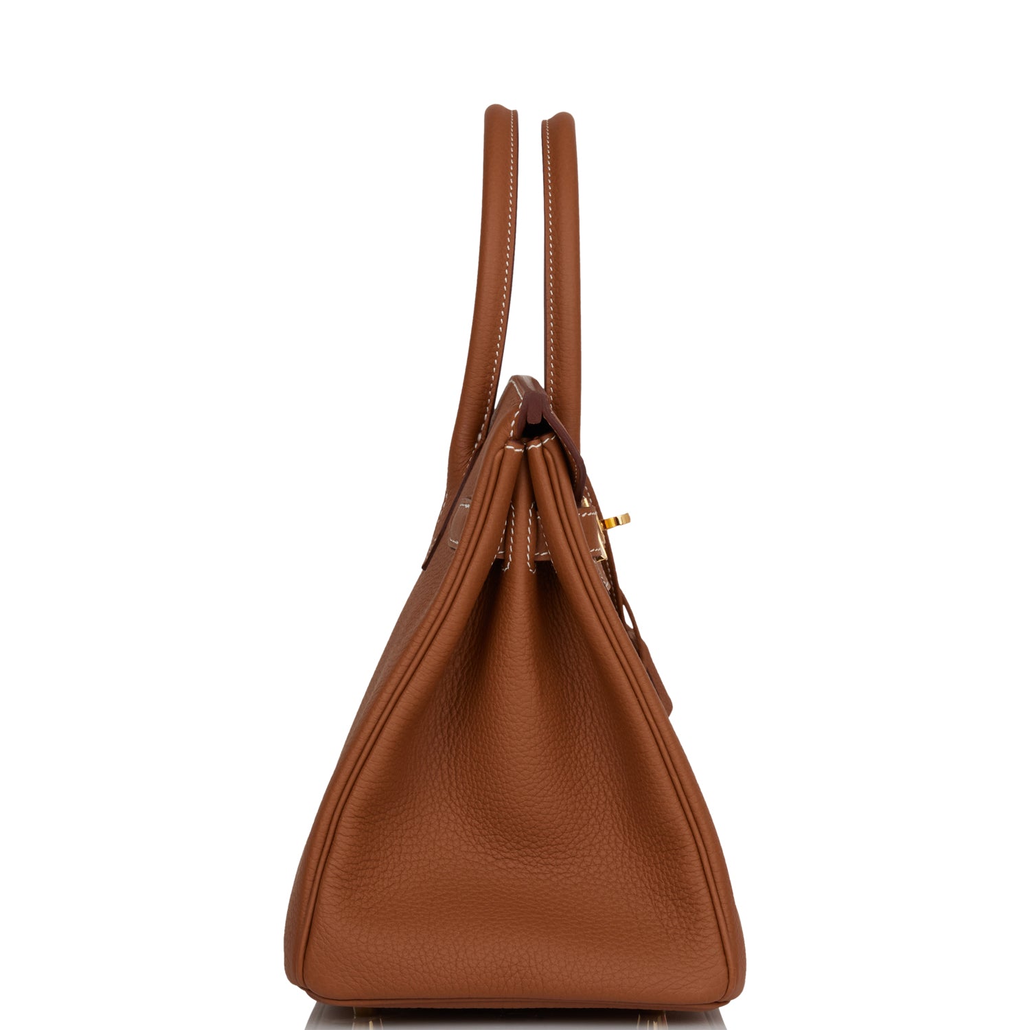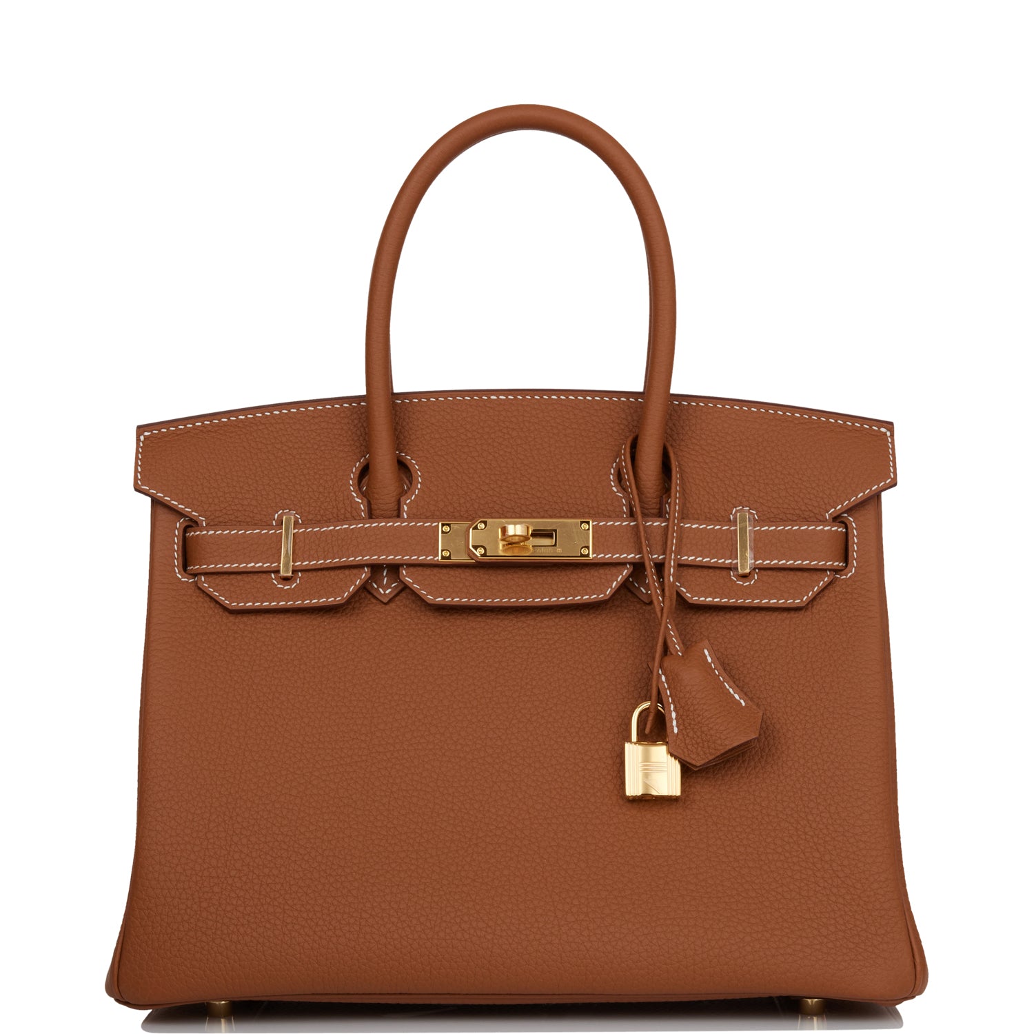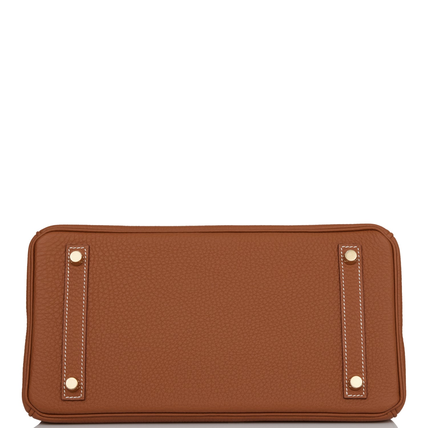 This Birkin is in gold togo leather with gold hardware and has white contrast stitching, front flap, two straps with center toggle closure, clochette with lock and two keys, and double rolled handles.