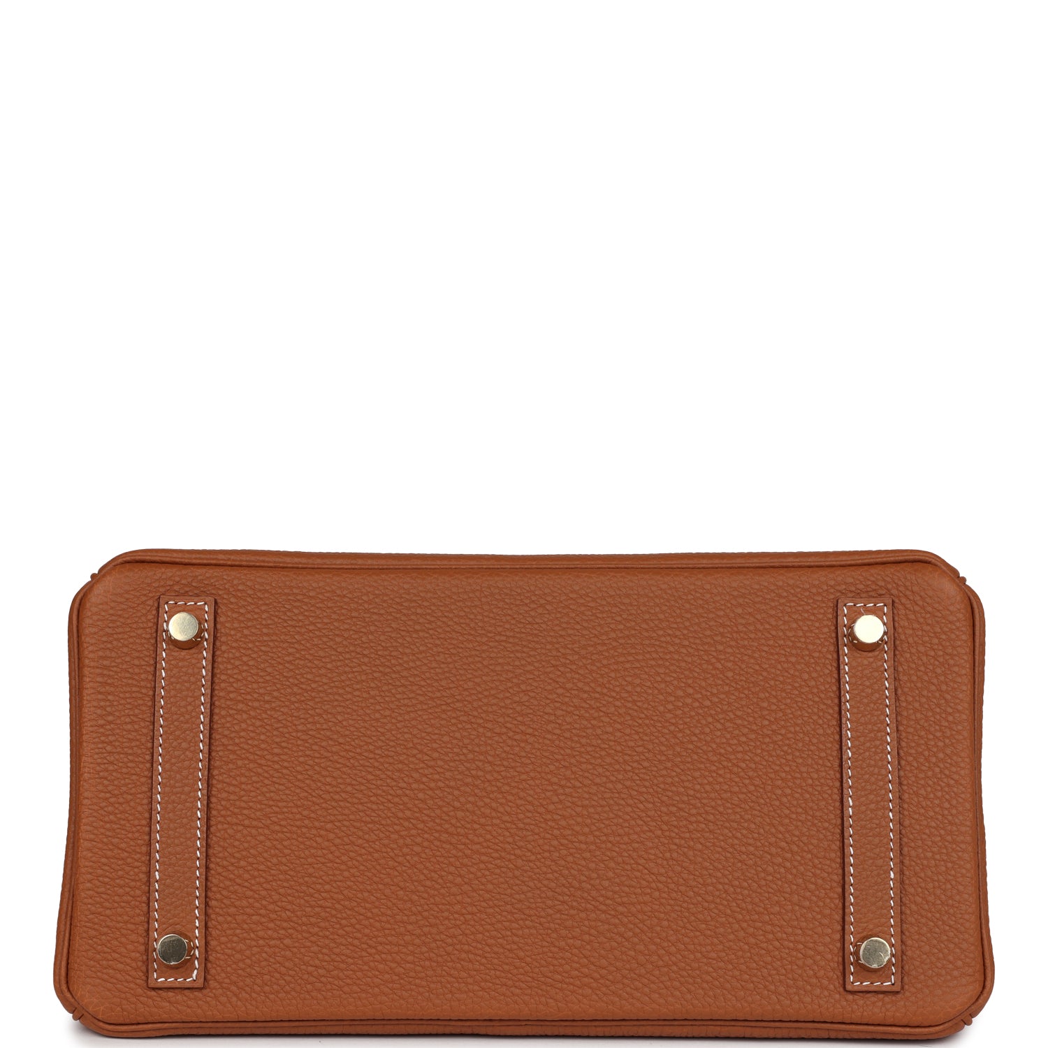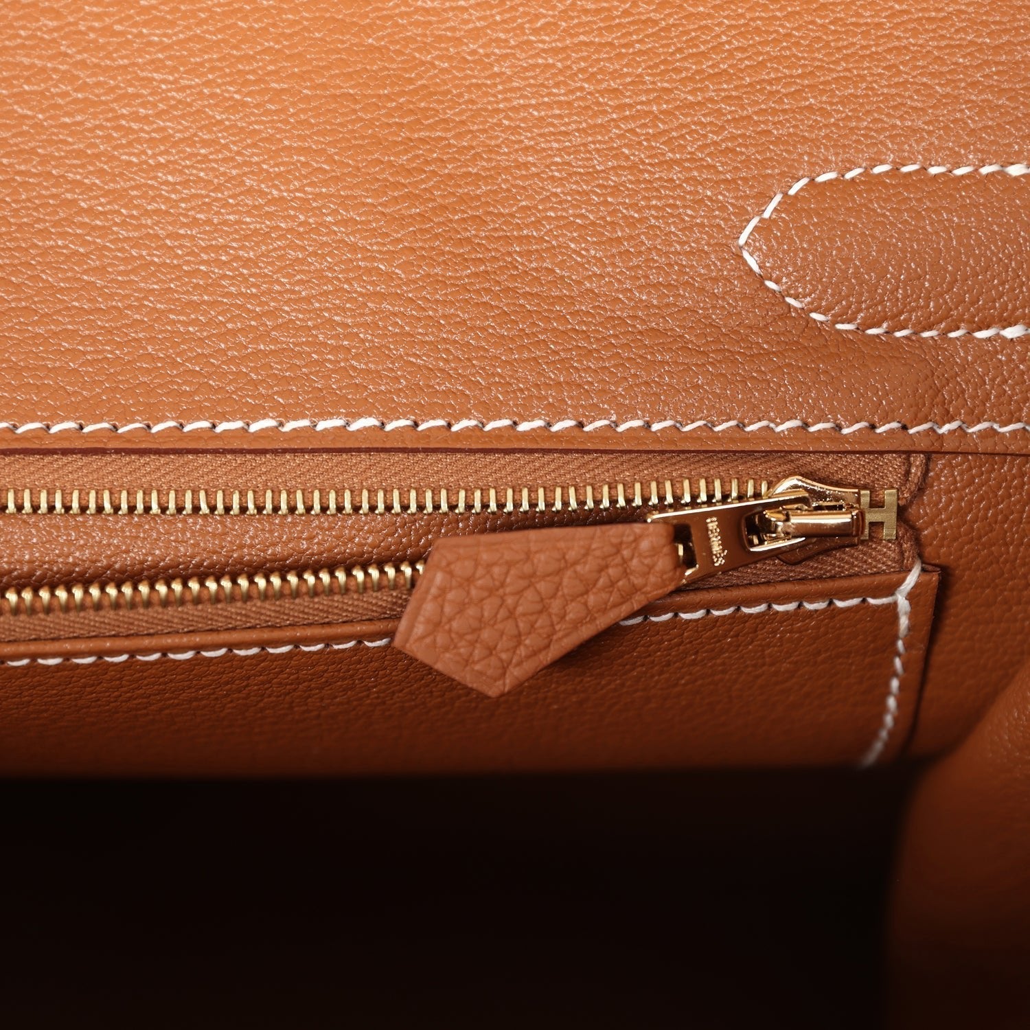 This Birkin is in Gold Togo with gold hardware and has contrast stitching, front flap with two straps, front toggle closure, clochette with lock and two keys, and double rolled handles