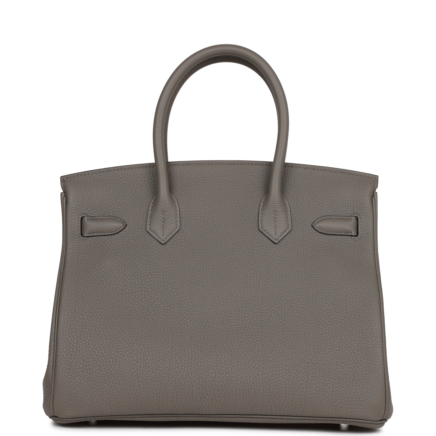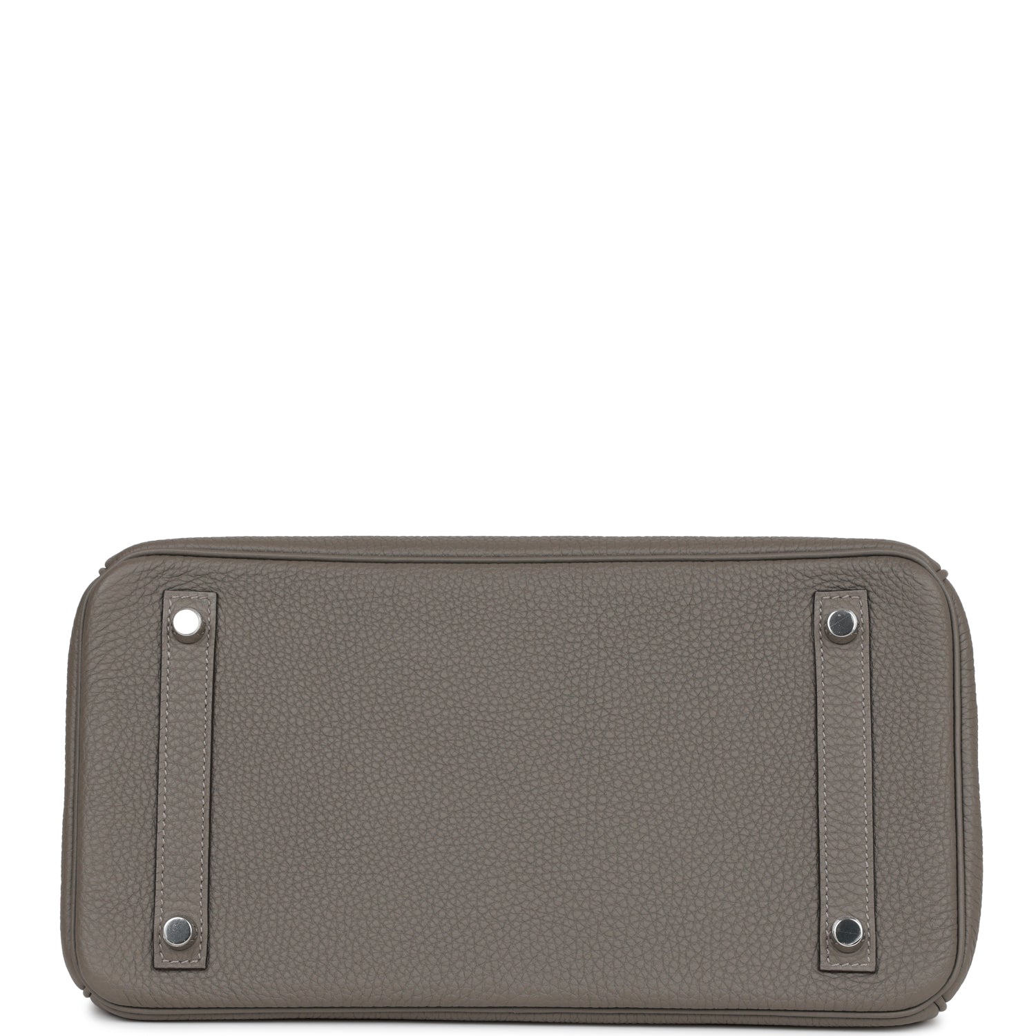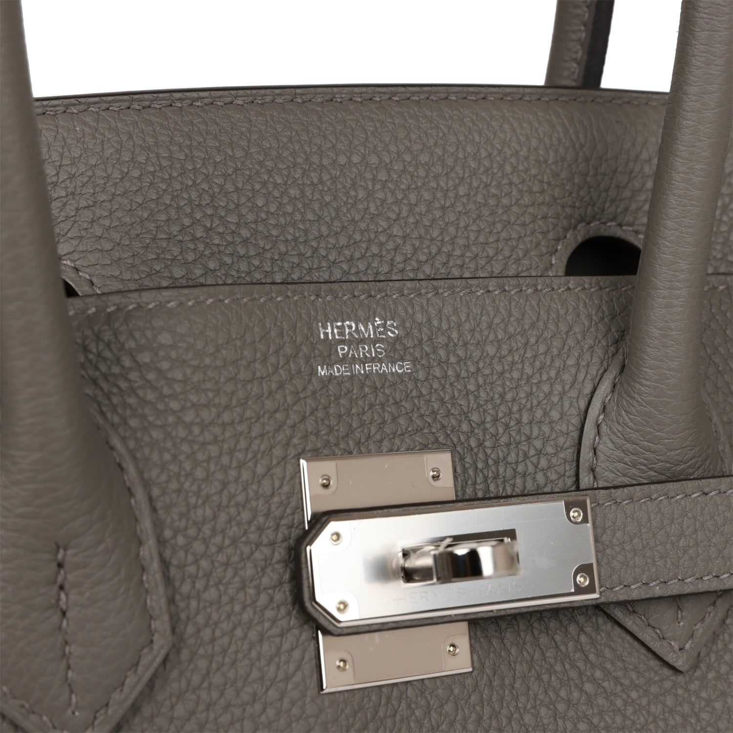 This Birkin is in Gris Meyer togo leather with palladium hardware and has tonal stitching, front flap, two straps with center toggle closure, clochette with lock and two keys, and double rolled handles.