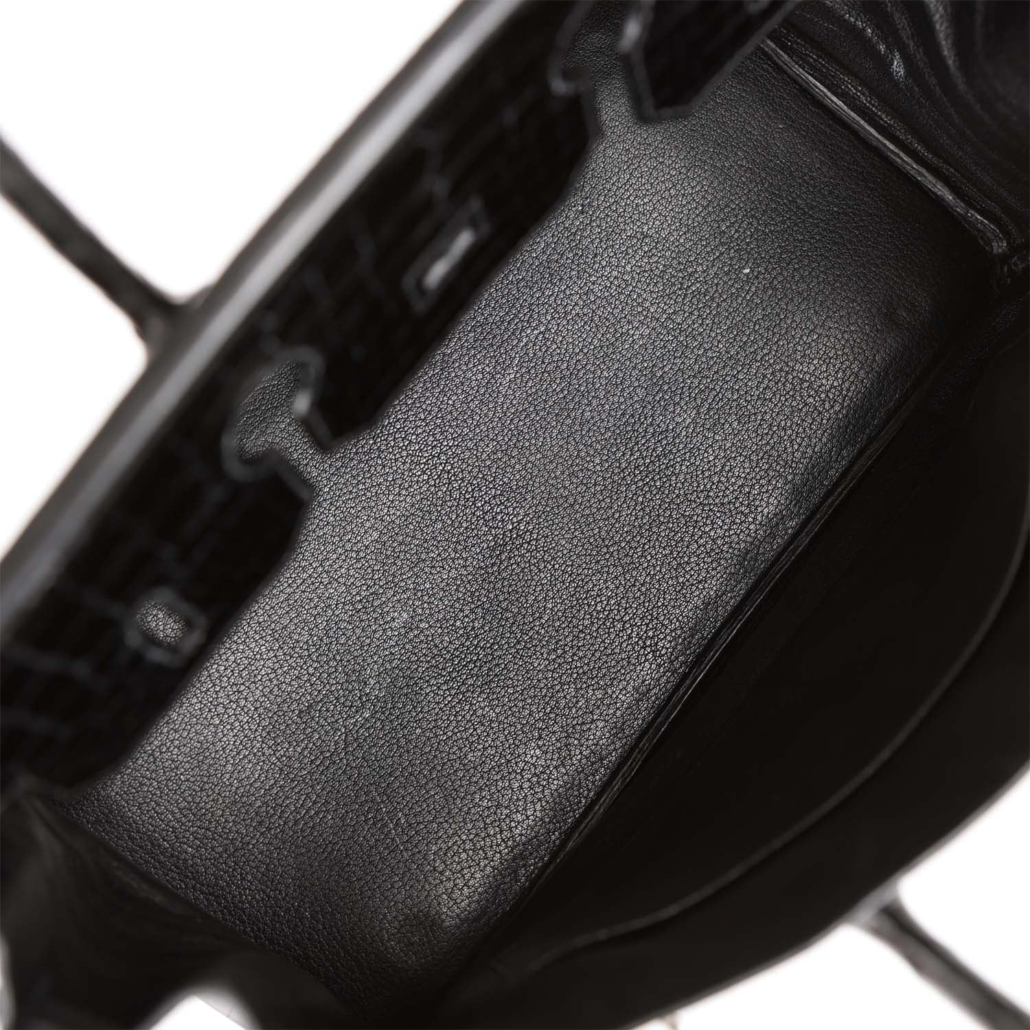 This Birkin is of black shiny Porosus crocodile with palladium hardware and features tonal stitching, front flap, two straps with center toggle closure, clochette with lock and two keys, and double rolled handles.