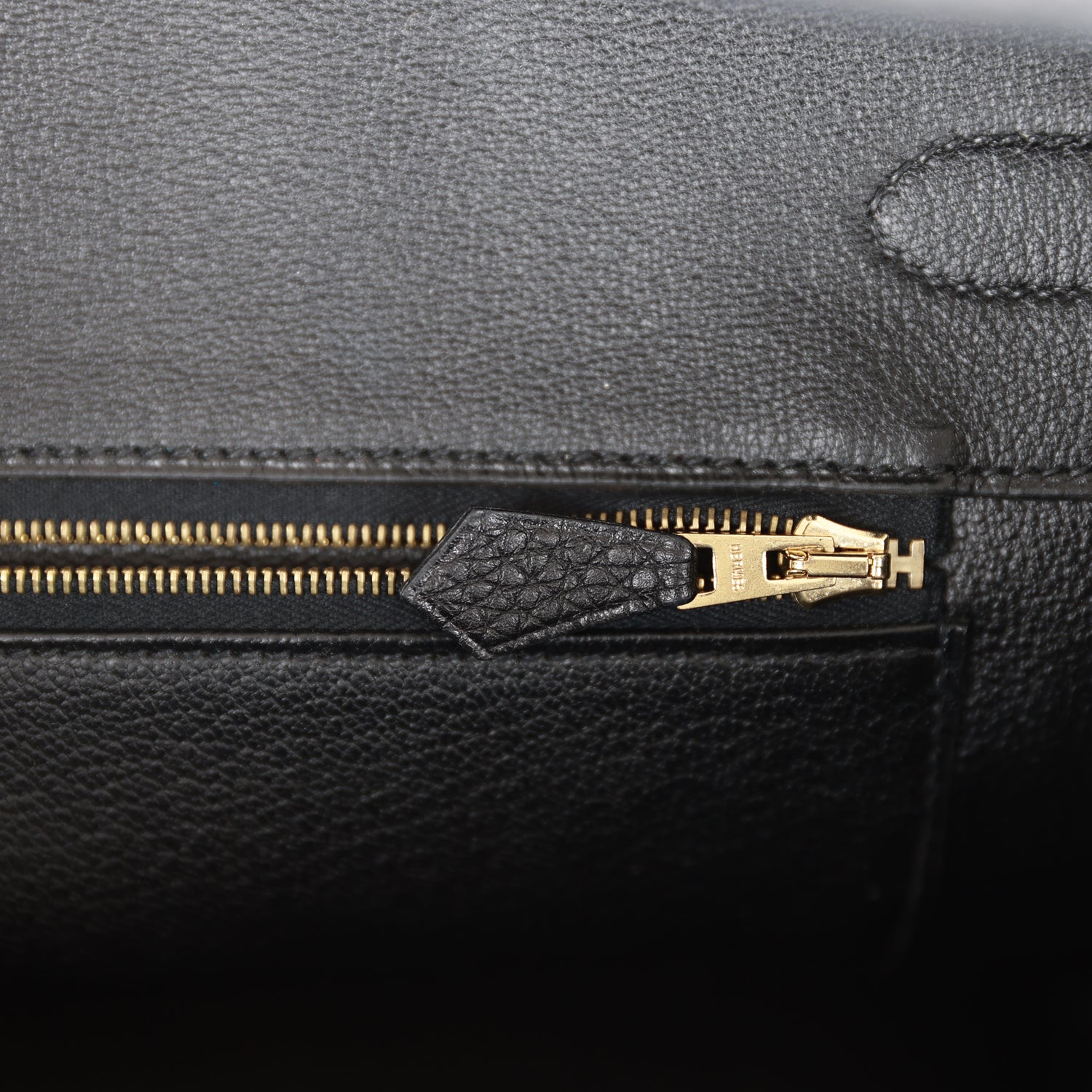 This Birkin is in black togo leather with gold hardware and has tonal stitching, front flap, two straps with center toggle closure, clochette with lock and two keys, and double rolled handles.