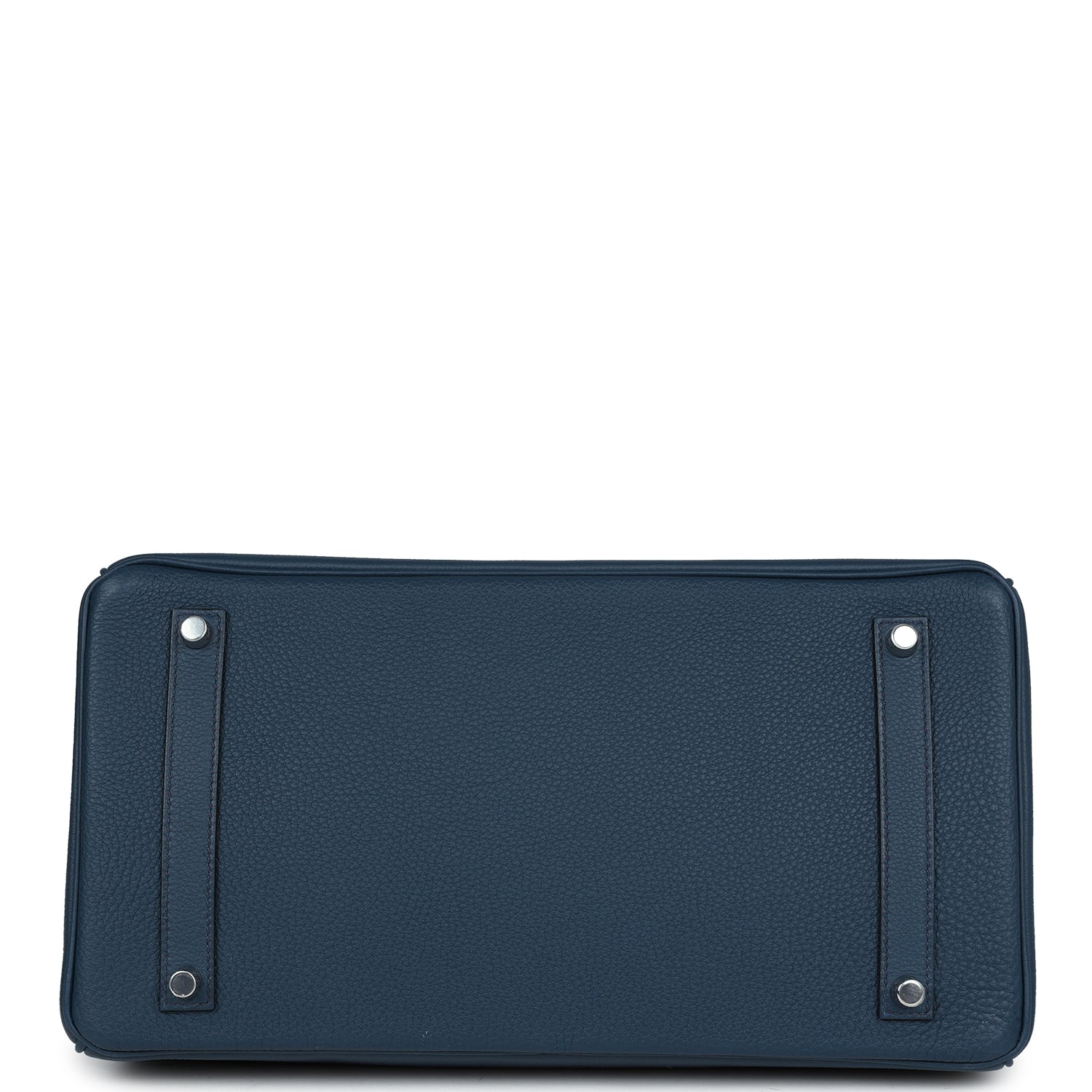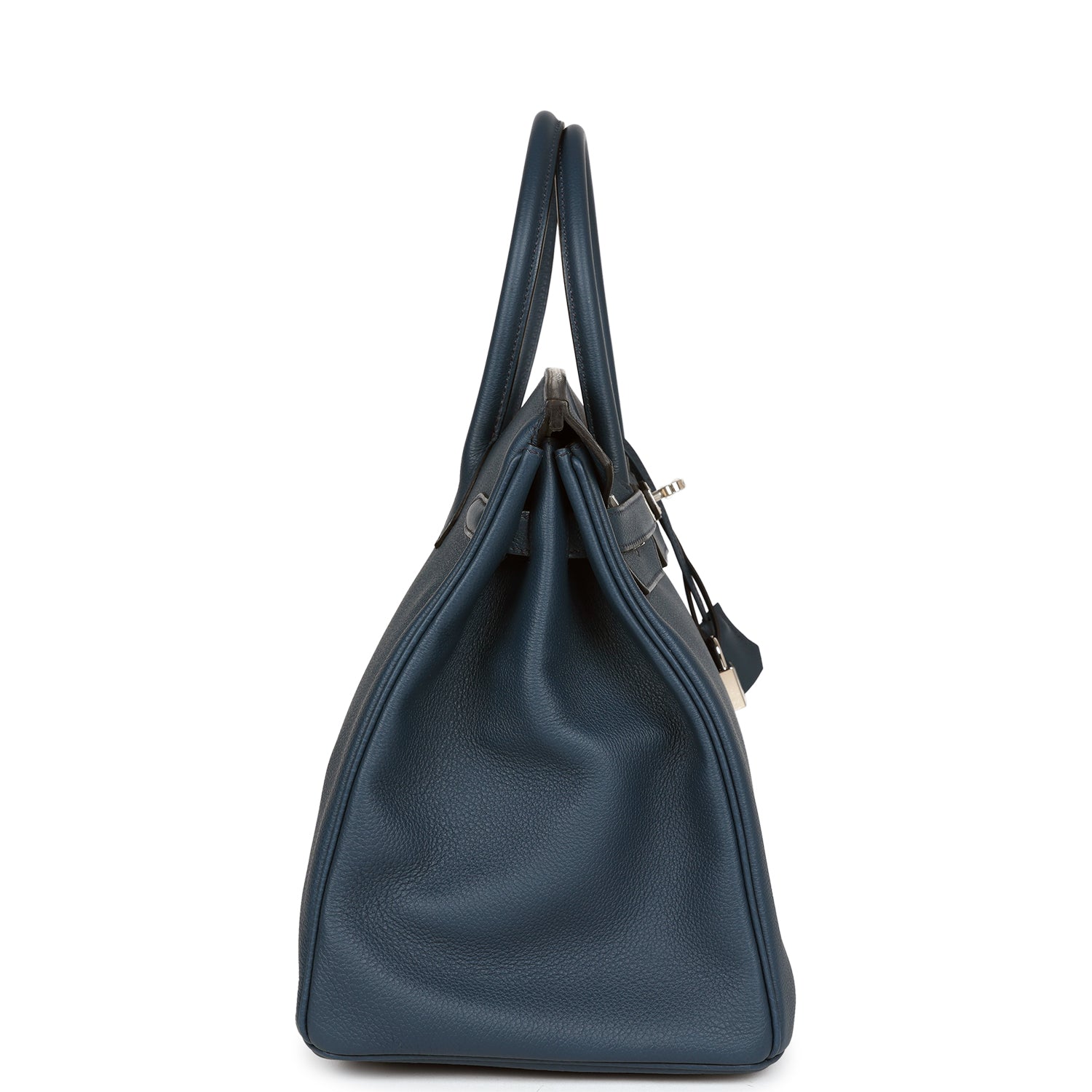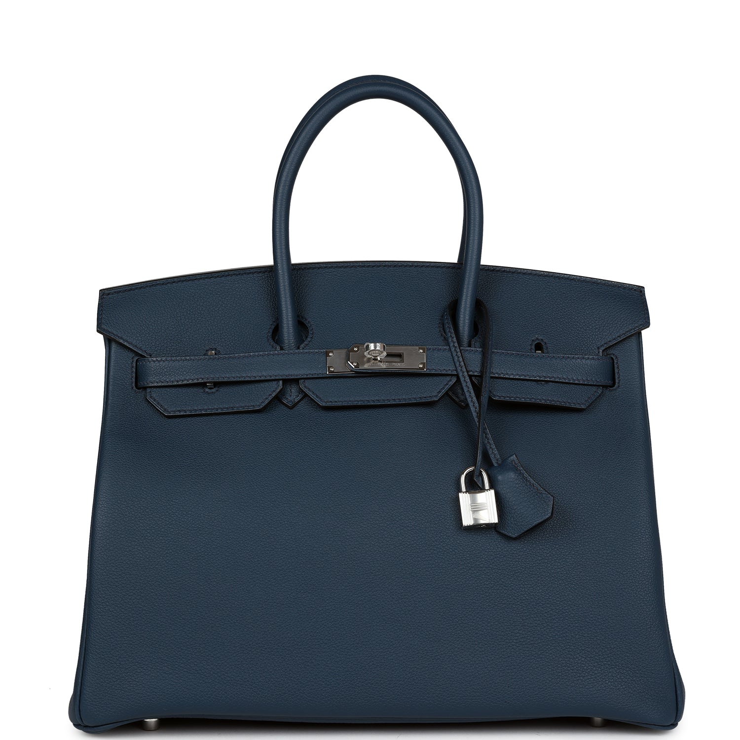 This Birkin is in Bleu De Prusse togo leather with palladium hardware features tonal stitching, front flap, two straps with center toggle closure, clochette with lock and two keys and double rolled handles.