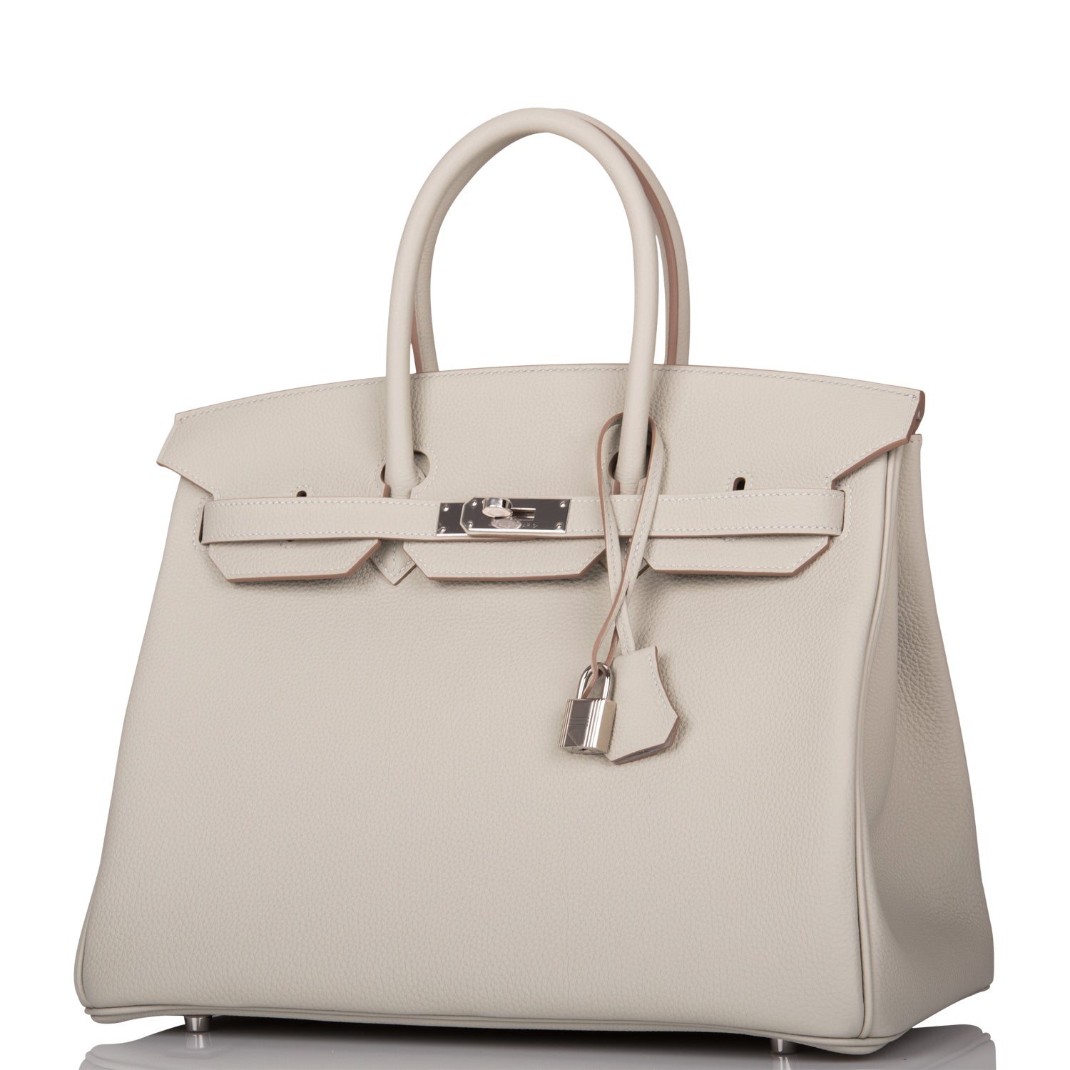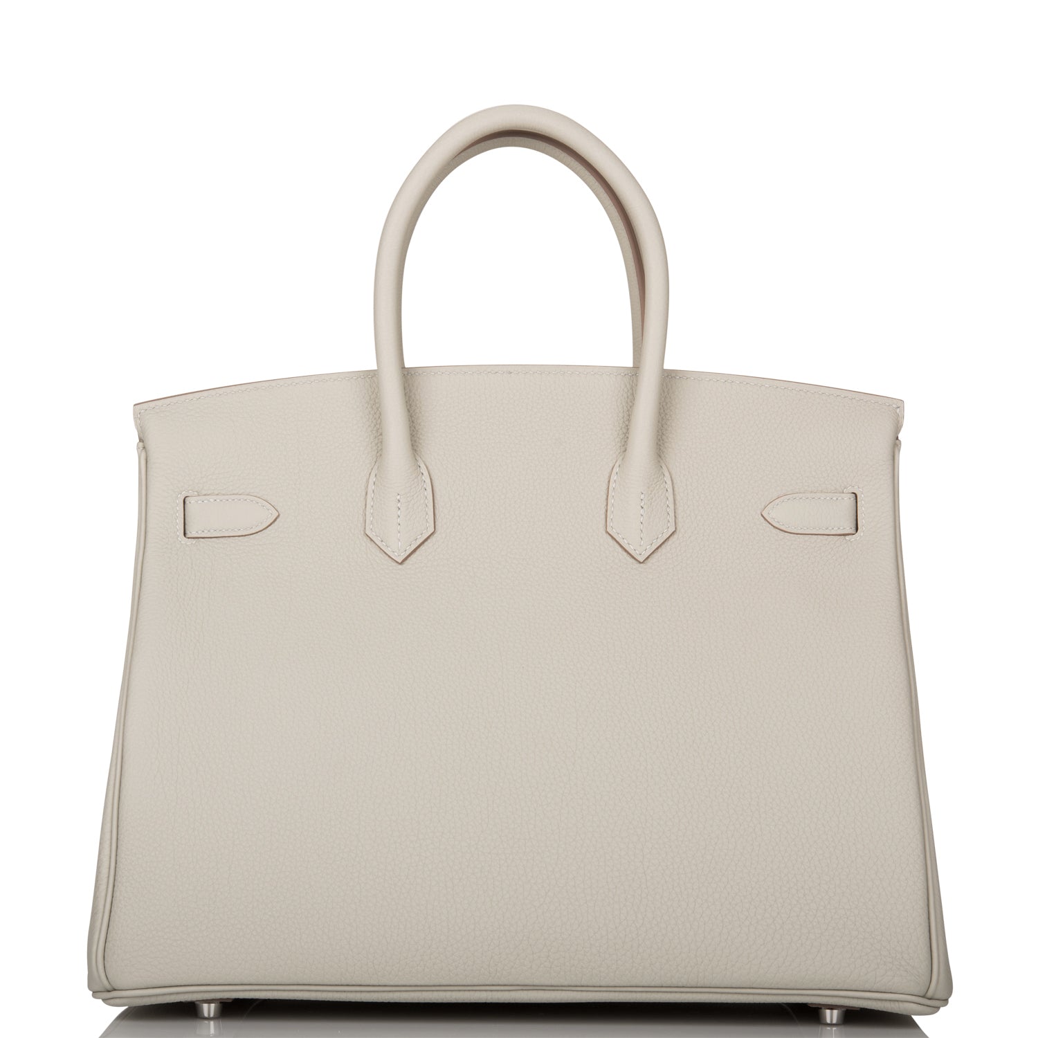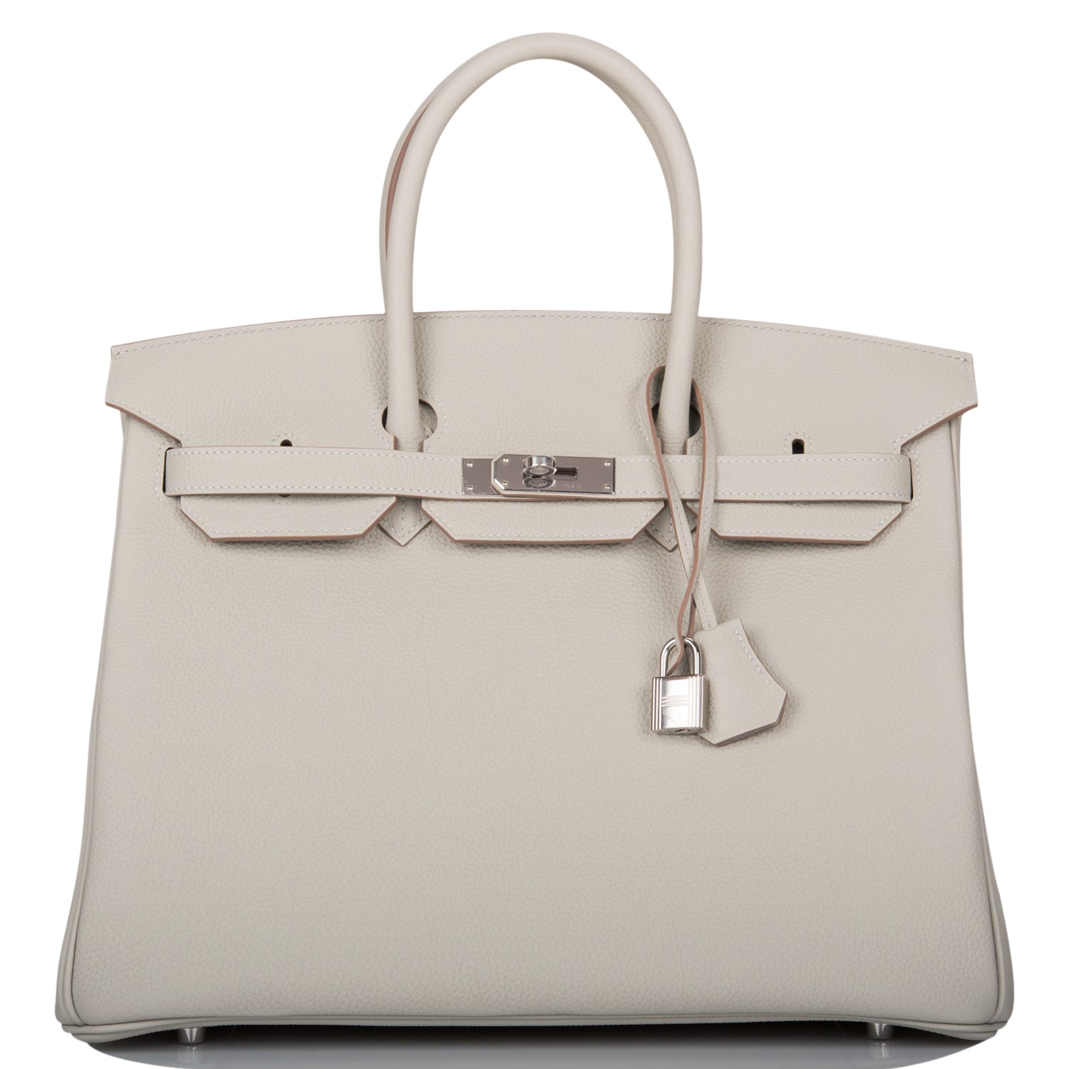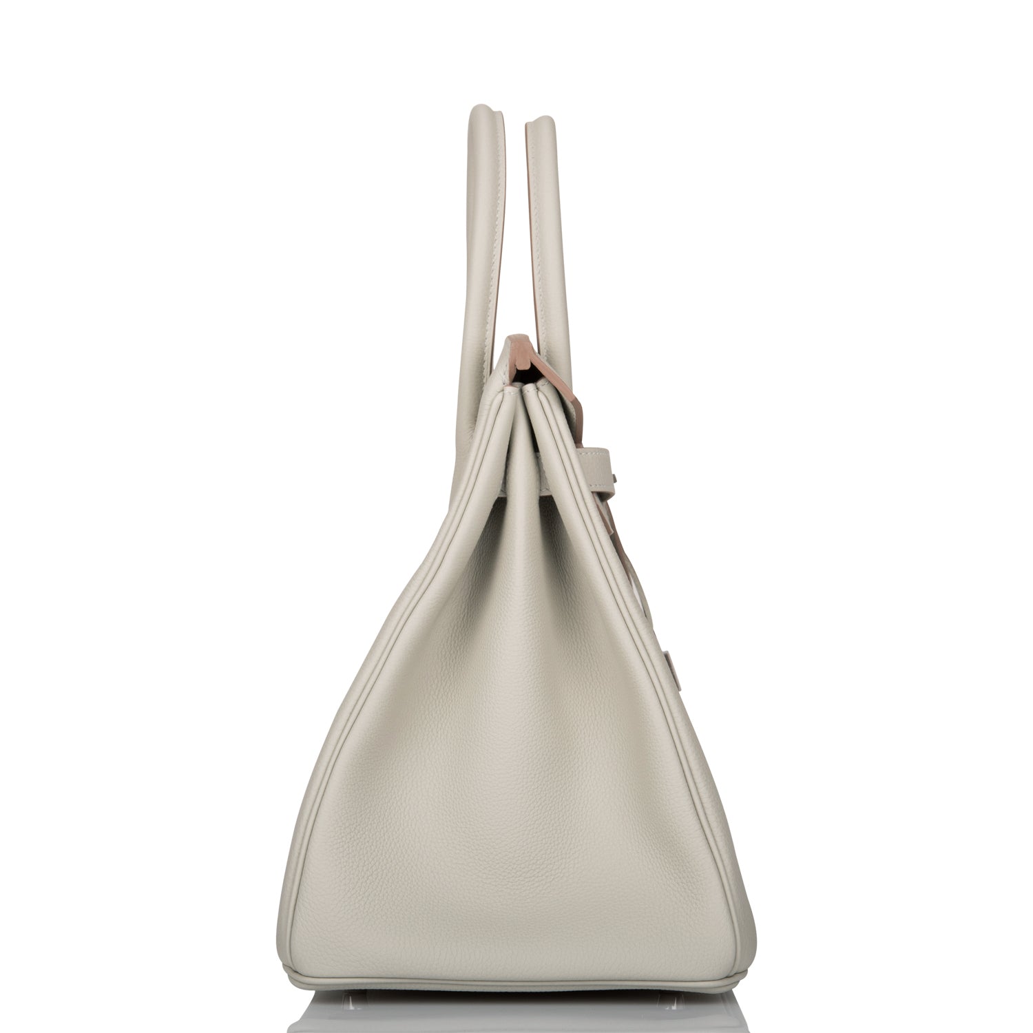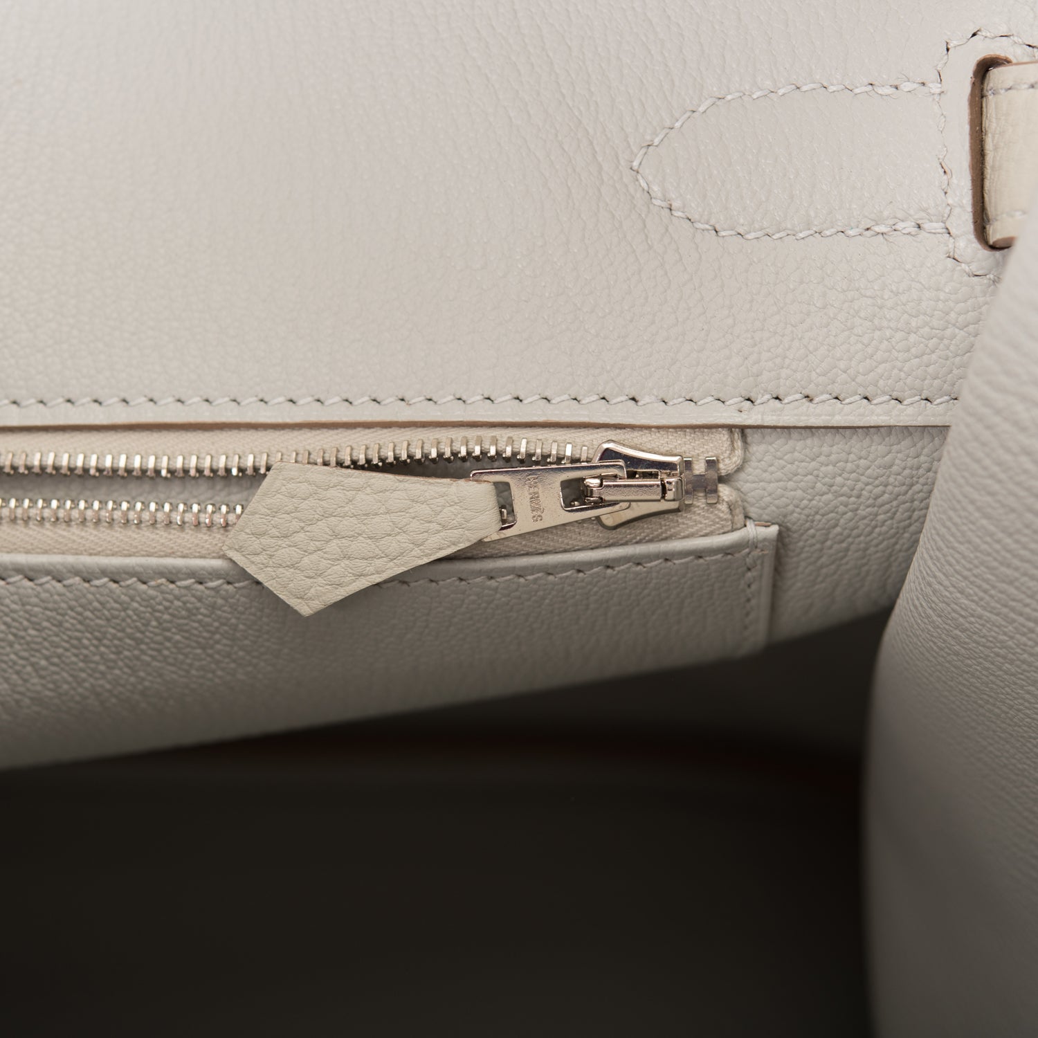 This Birkin is in Gris Perle togo leather with palladium hardware and features tonal stitching, front flap, two straps with center toggle closure, clochette with lock and two keys and double rolled handles.