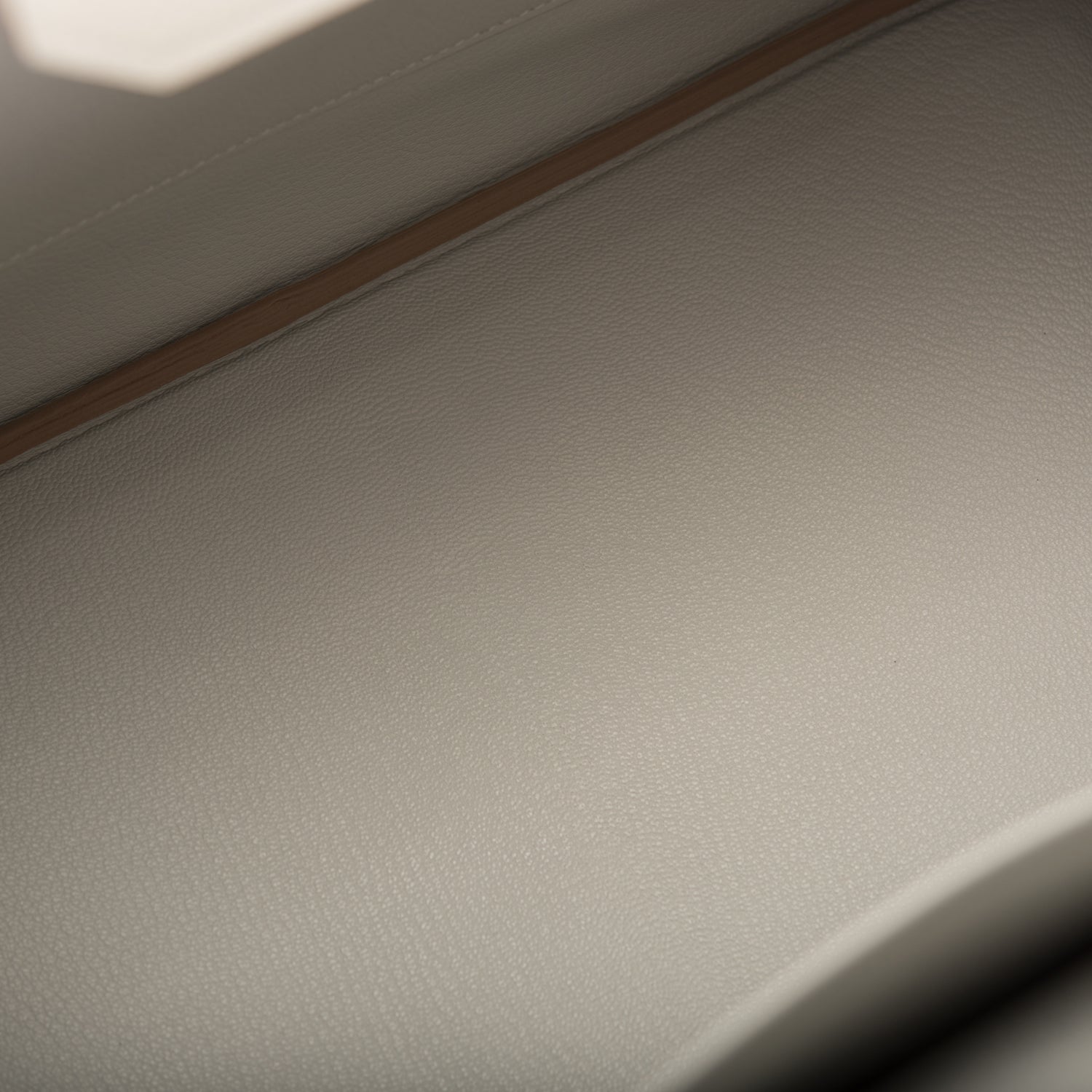The interior is lined in Gris Perle chevre with one zip pocket with an Hermes engraved zipper pull and an open pocket on the opposite side.