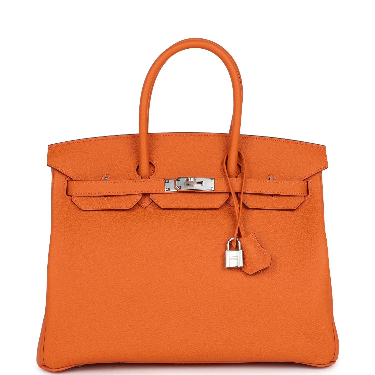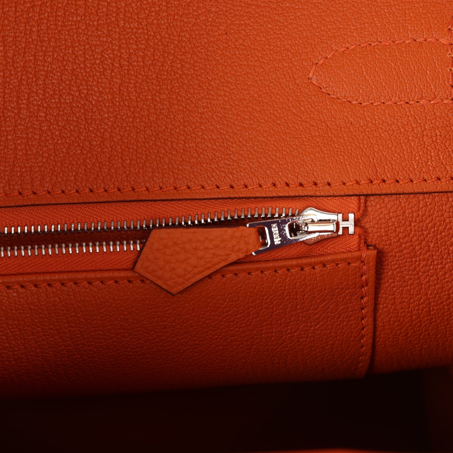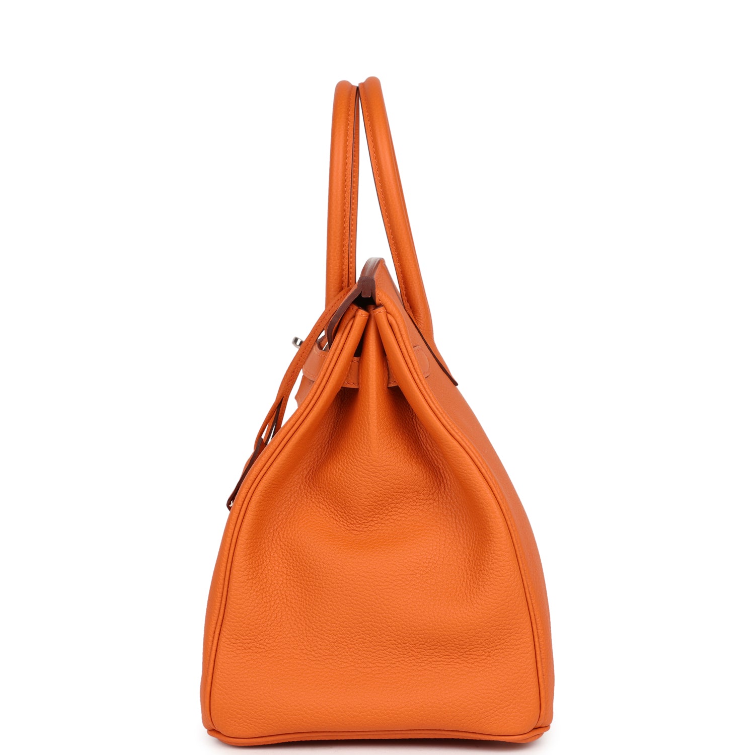 This Birkin is in Orange togo leather with palladium hardware has tonal stitching, front flap, two straps with center toggle closure, clochette with lock and two keys, and double rolled handles.