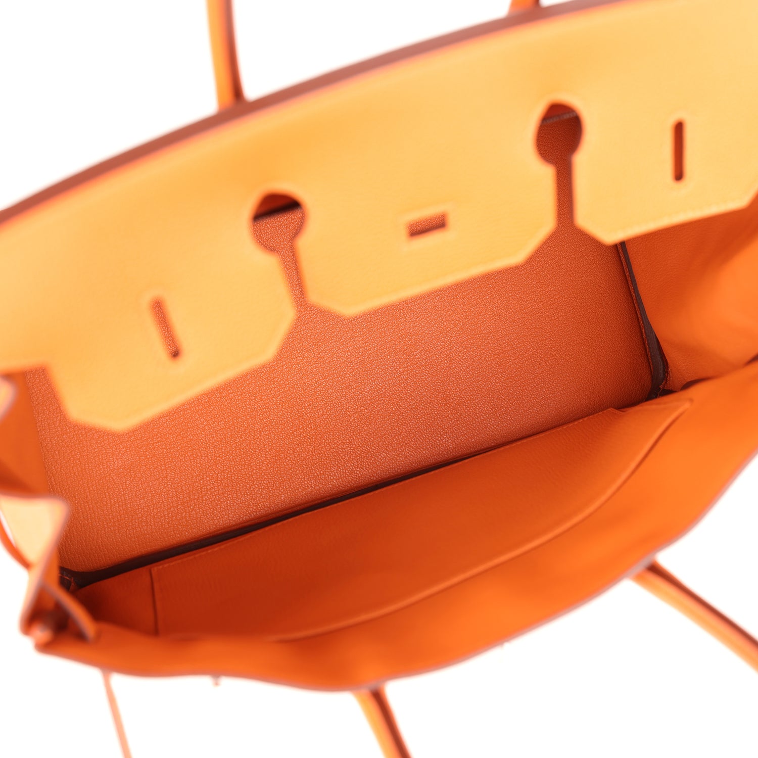 The interior is lined with Orange chevre and has one zip pocket with an Hermes engraved zipper pull and an open pocket on the opposite side.