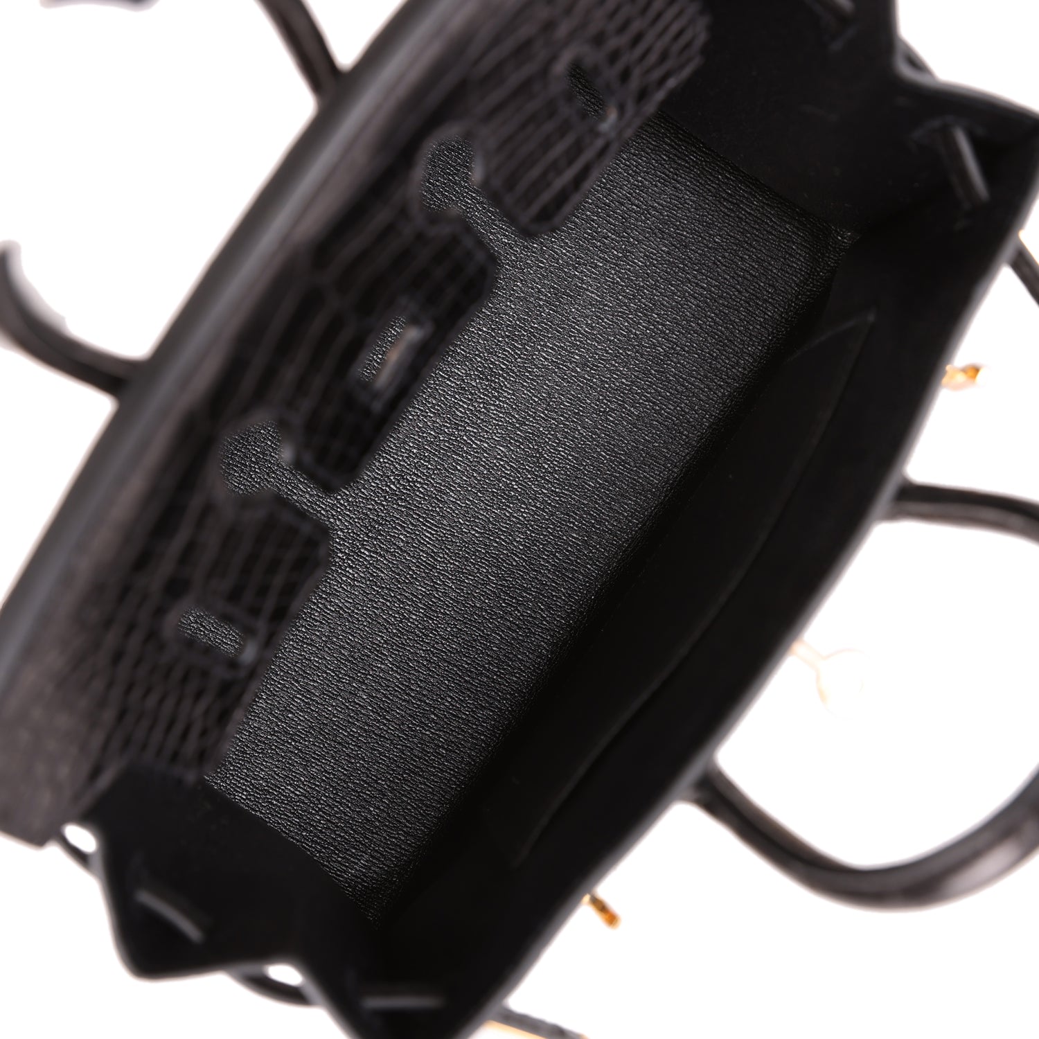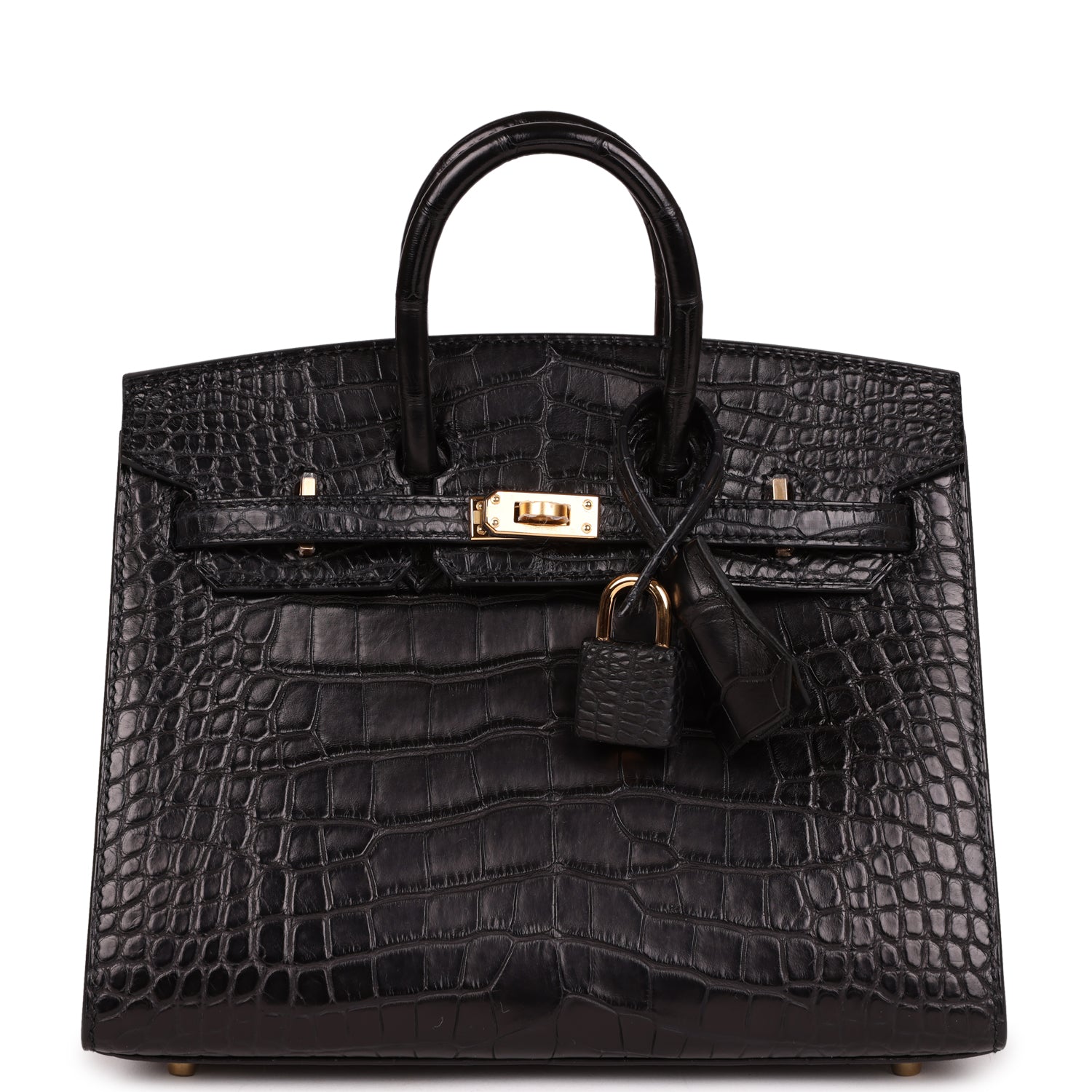 This Tiny Birkin Sellier is in Black Matte Alligator with Gold Hardware, tonal stitching, front flap with two straps, front toggle closure, clochette with lock and two keys, and two rolled handles.
