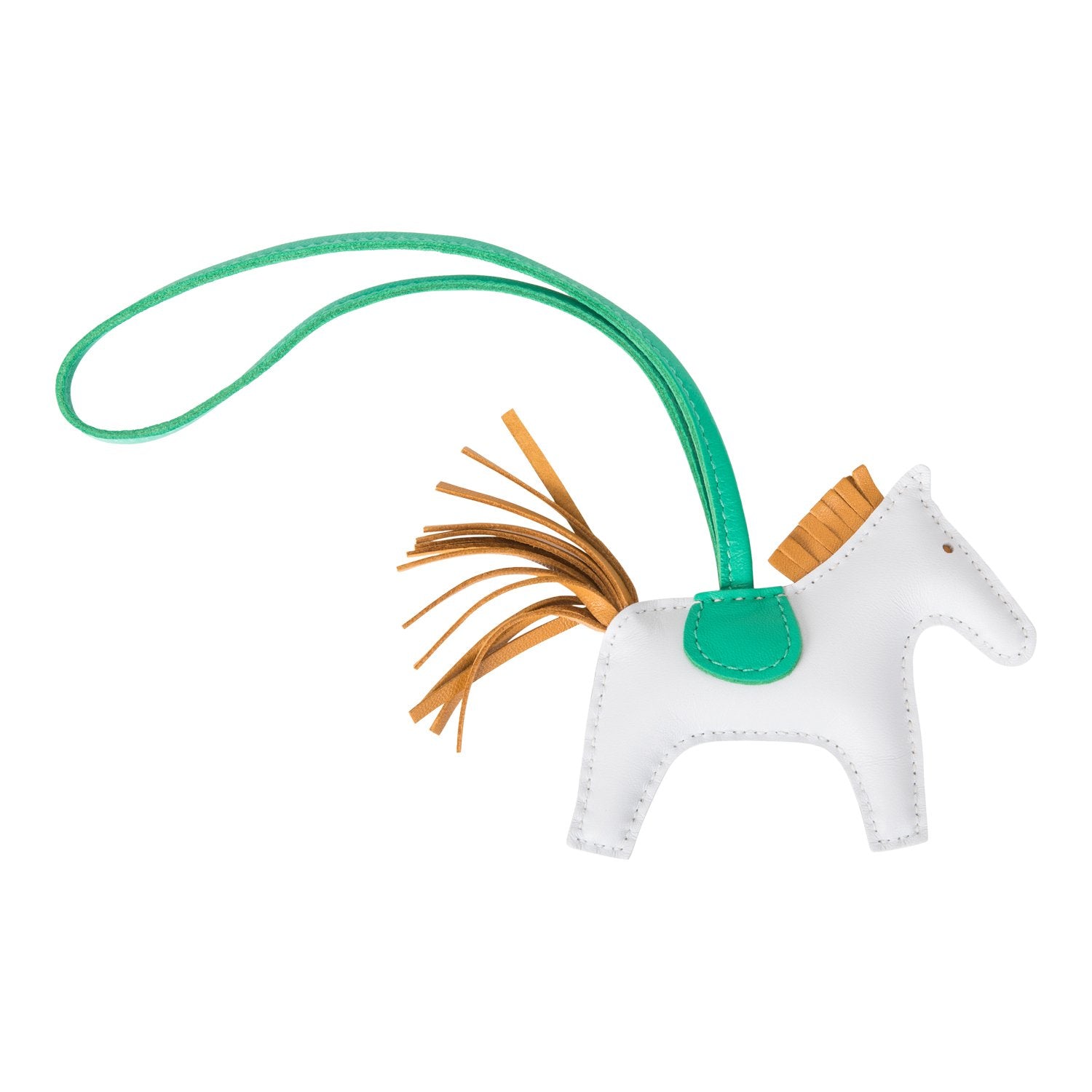 This Grigri Rodeo bag charm is in Bleu Brume Milo lambskin leather and accented with a Sesame mane and tail and a Menthe saddle and holder.