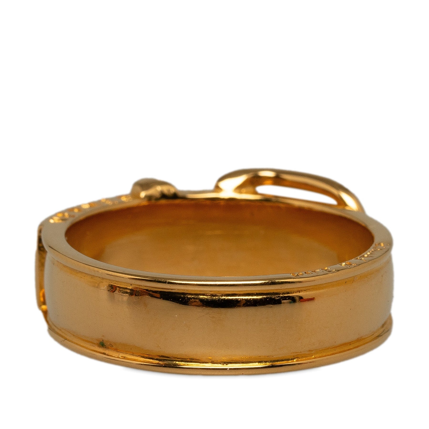 This scarf ring features a belt buckle detail in gold-tone metal body. Comes with box.