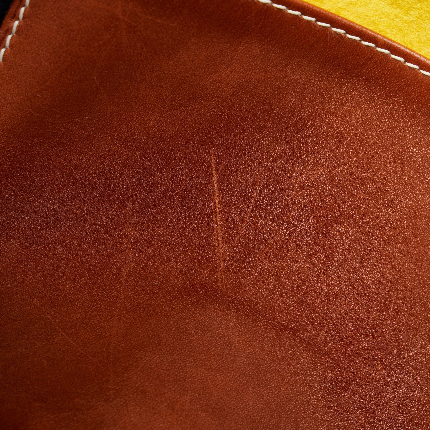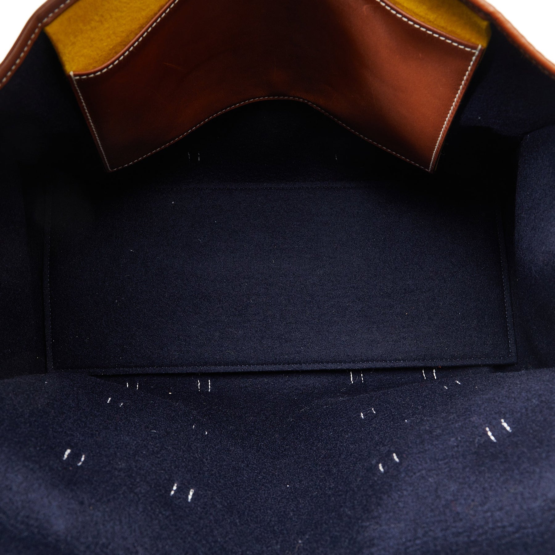 This tote bag features a wool body with leather trim, flat leather handles, a top flap, an exterior side slip pockets, and interior pockets. Comes with dust bag