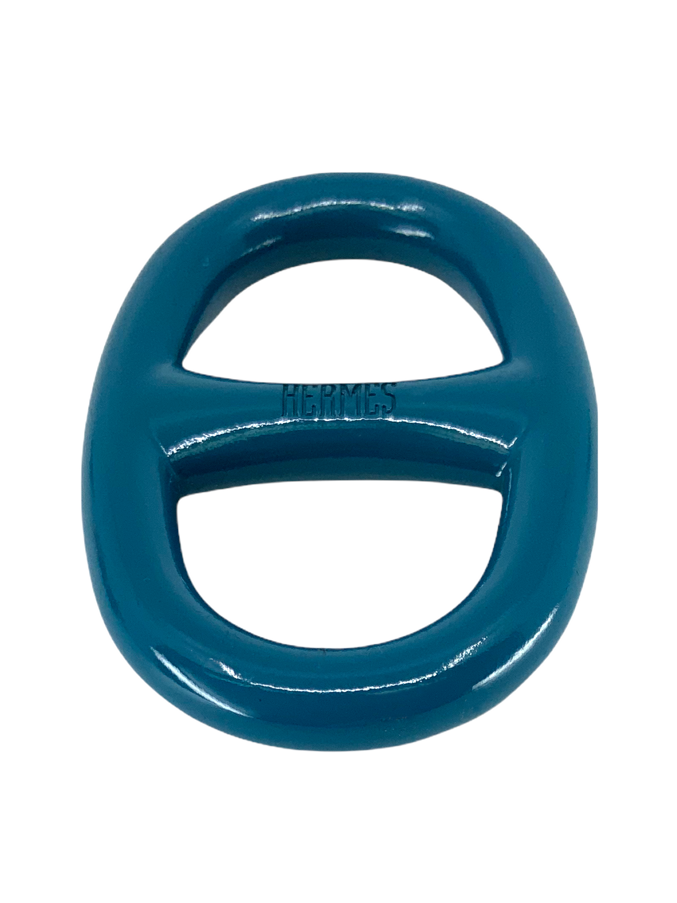This highly sought after HERMES Chaine D'Ancre Scarf Ring makes for a perfect addition to any scarf. Featuring teal blue metal with a signature logo-engraving at center. Wear this to secure your scarf in place and to add a touch of style to your wardrobe.