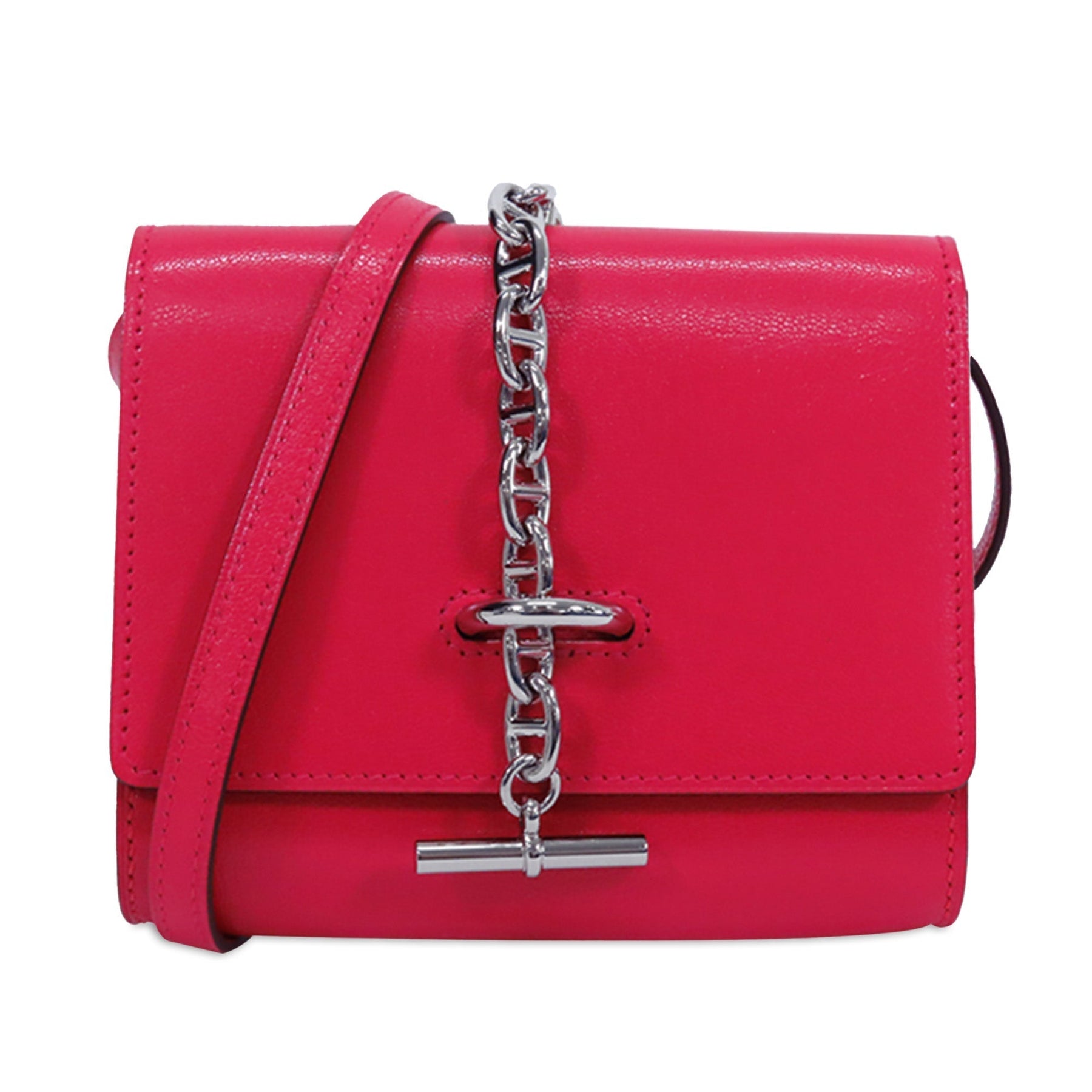 This crossbody features a chevre mysore leather body in Rose Extreme color, a removable flat leather shoulder strap, a front flap with chain metal hook closure, and an interior zip pocket. Comes with box.