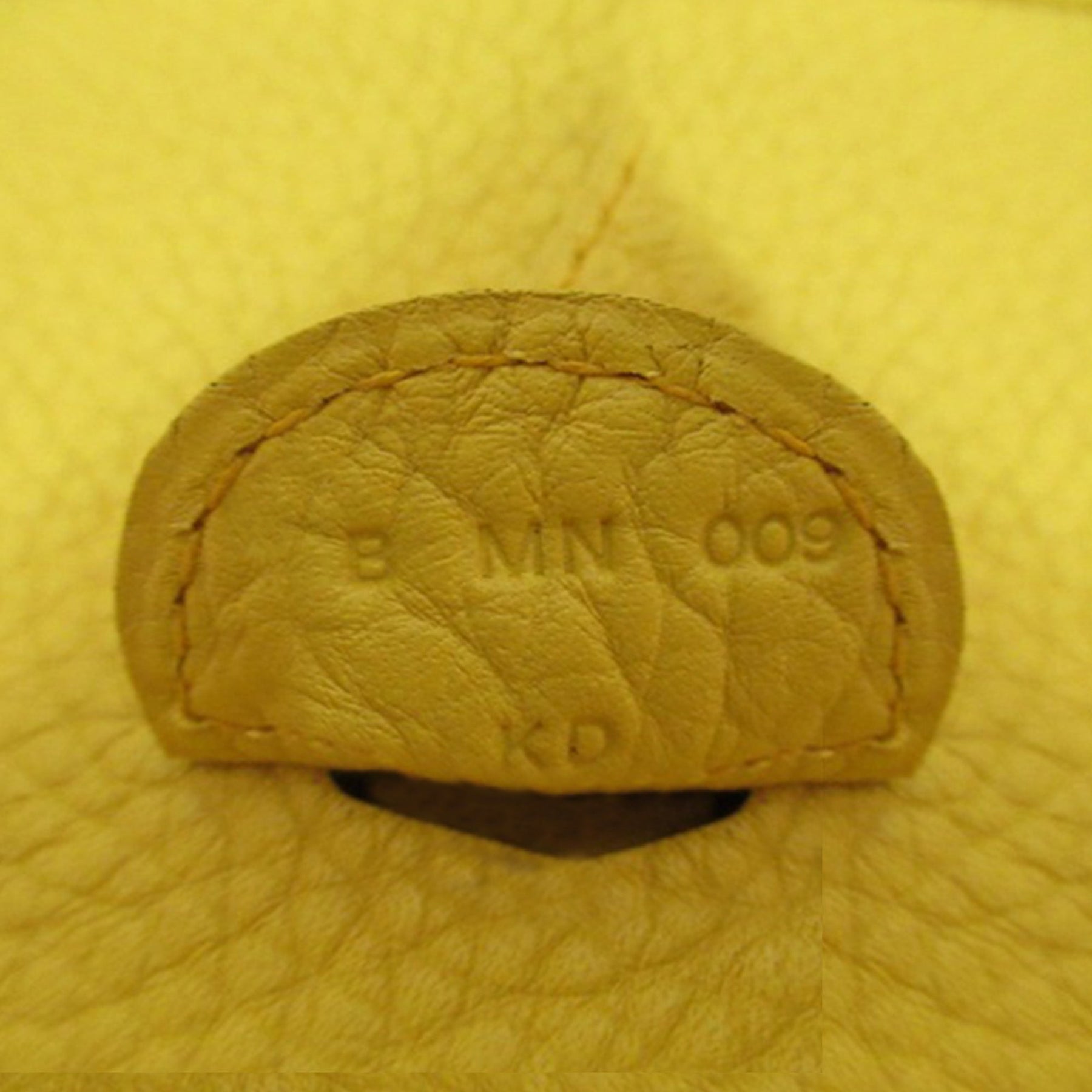 The Evelyne III PM features a clemence leather body, a removable canvas shoulder strap, an open top with strap closure, and an exterior back slip pocket.