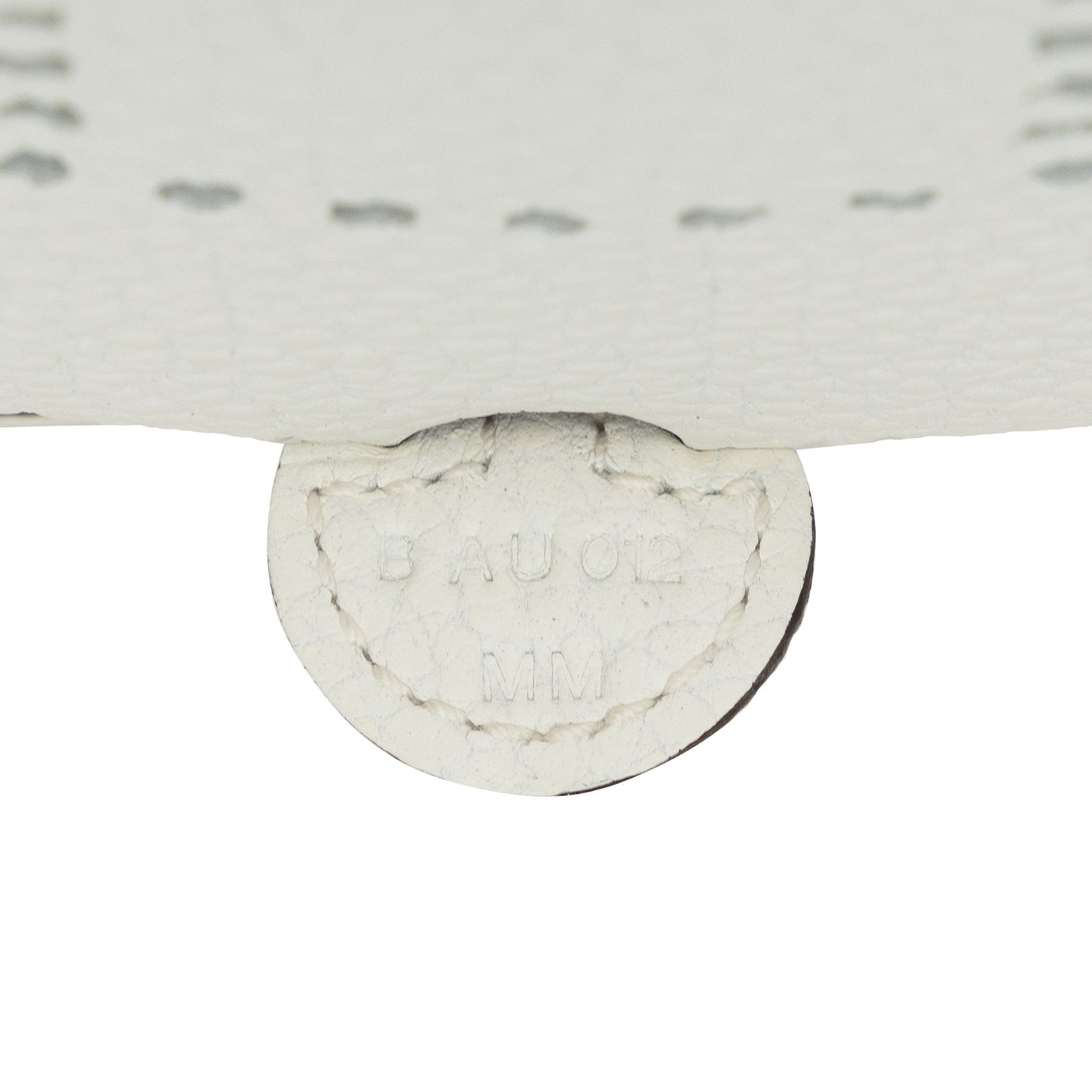 The Evelyne TPM features a Clemence leather body, a flat canvas strap, and an open top with a tuck closure. Comes with box and dust bag.
