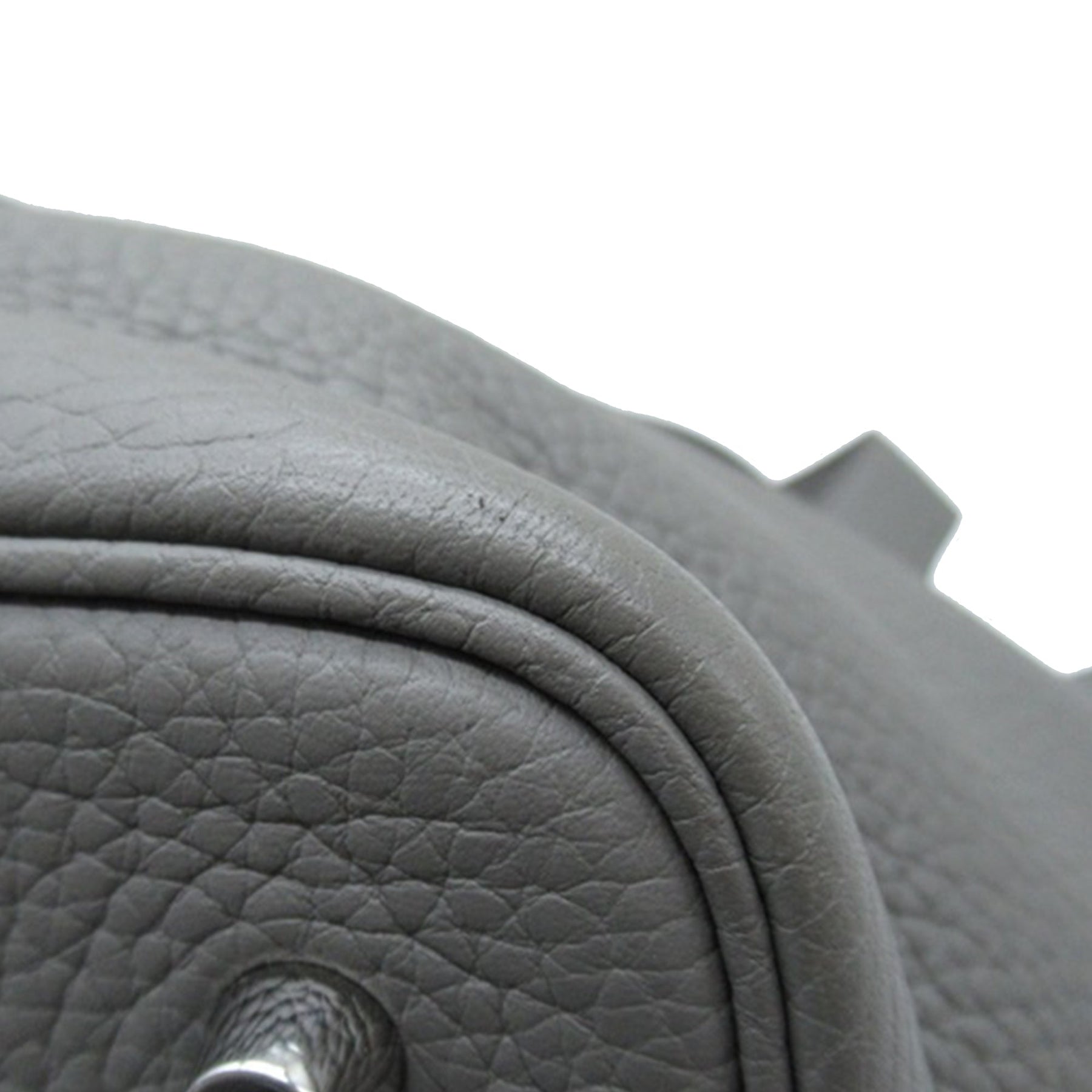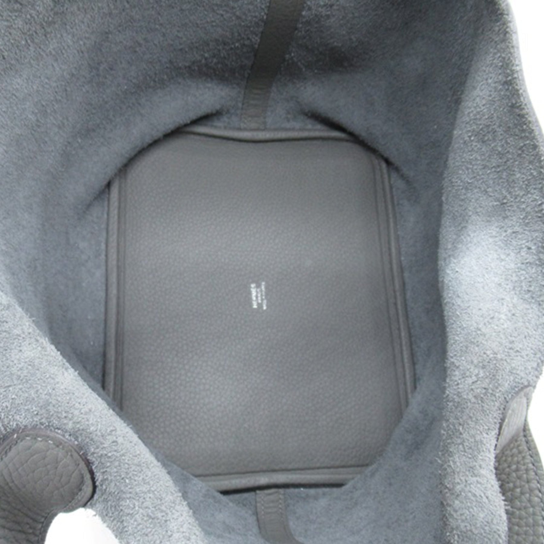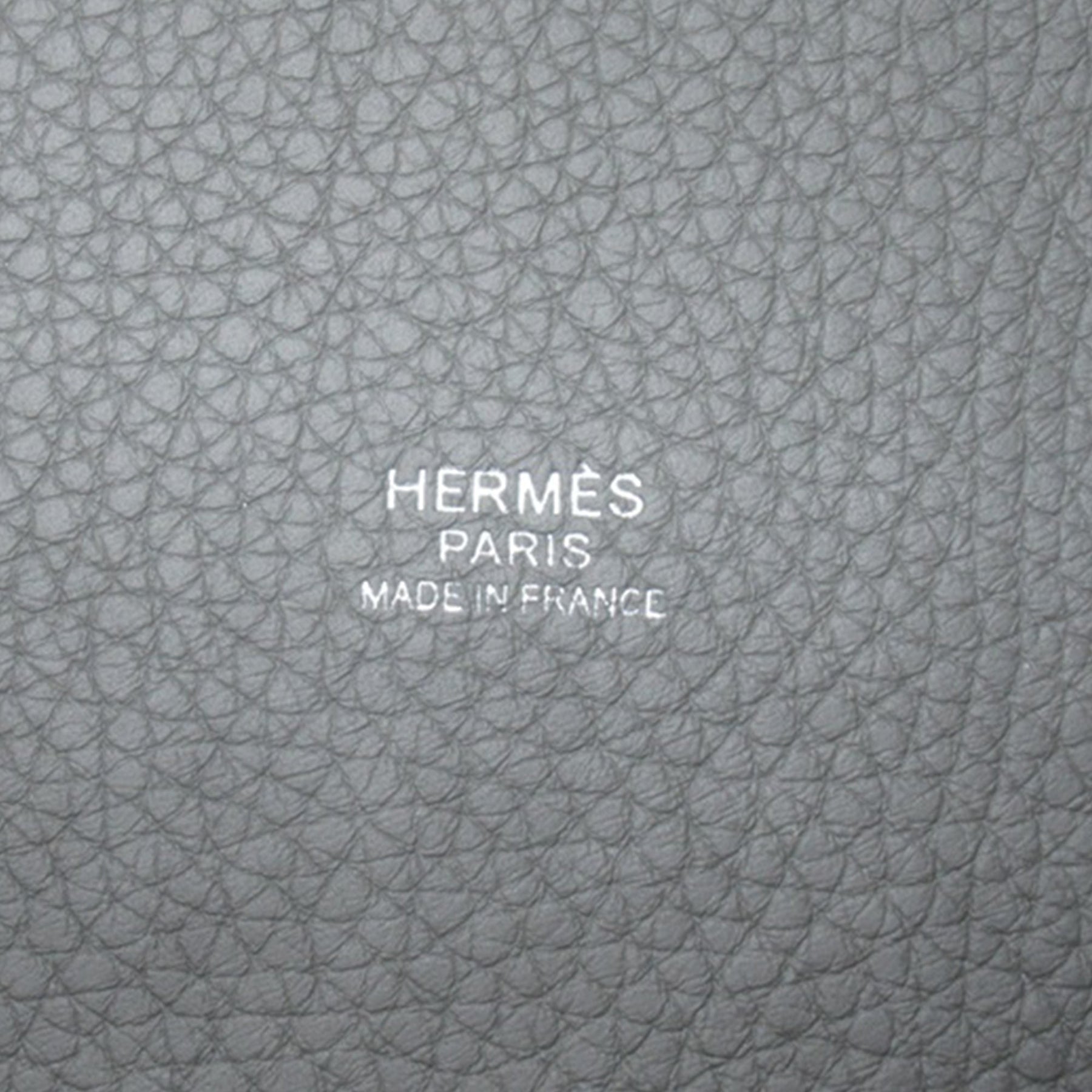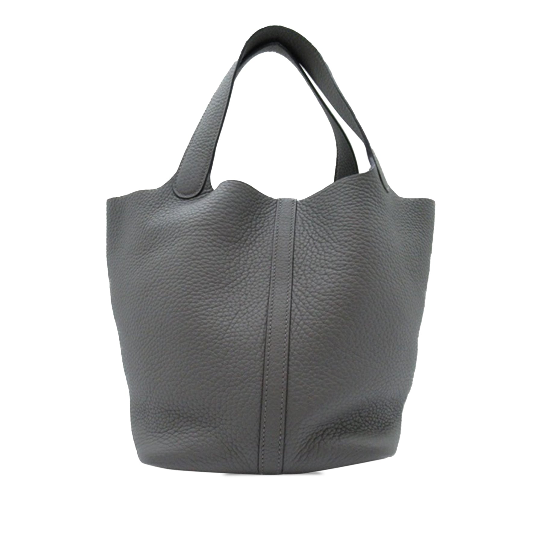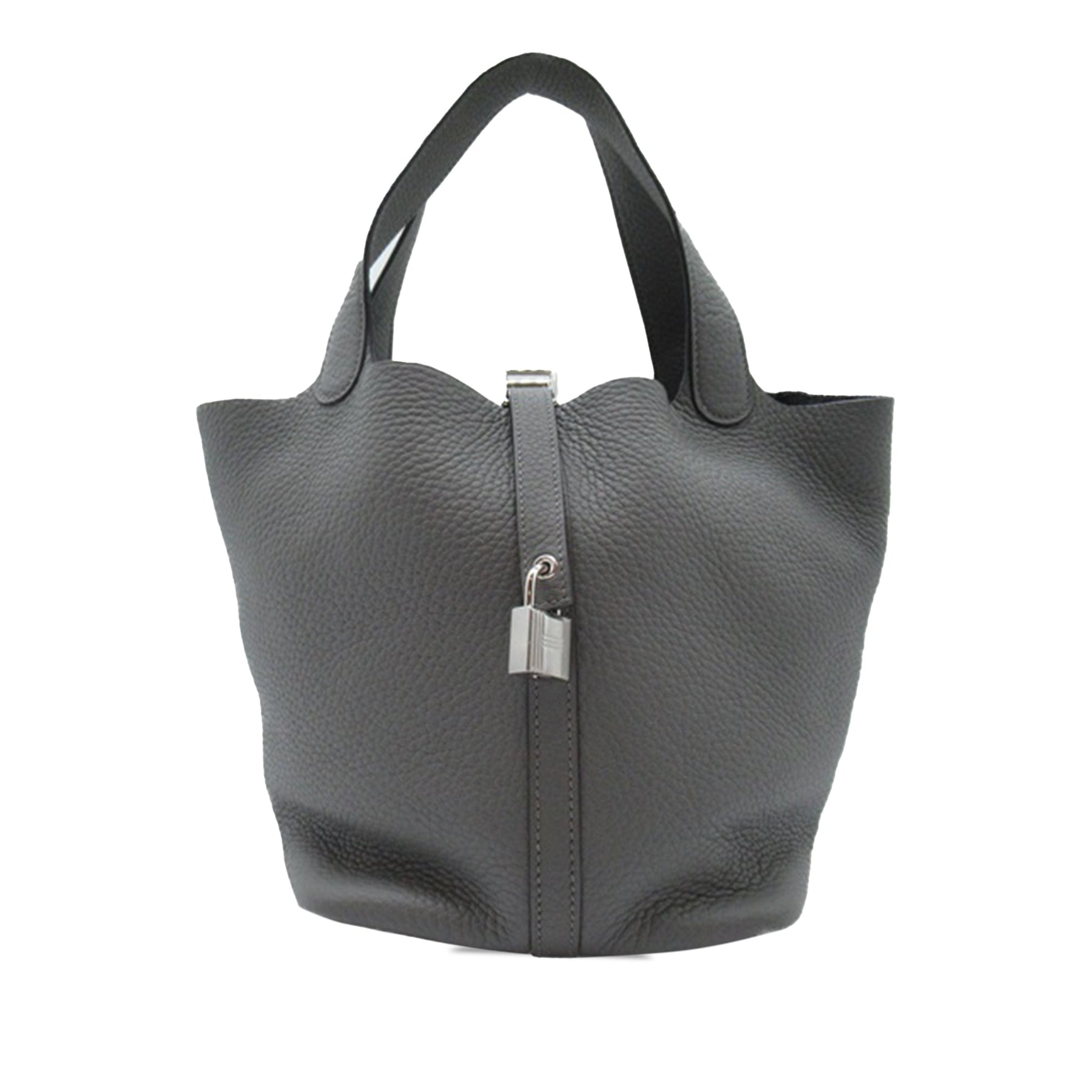 The Picotin Lock MM features a leather body, flat leather handles, and a top pull through closure. Comes with dust bag