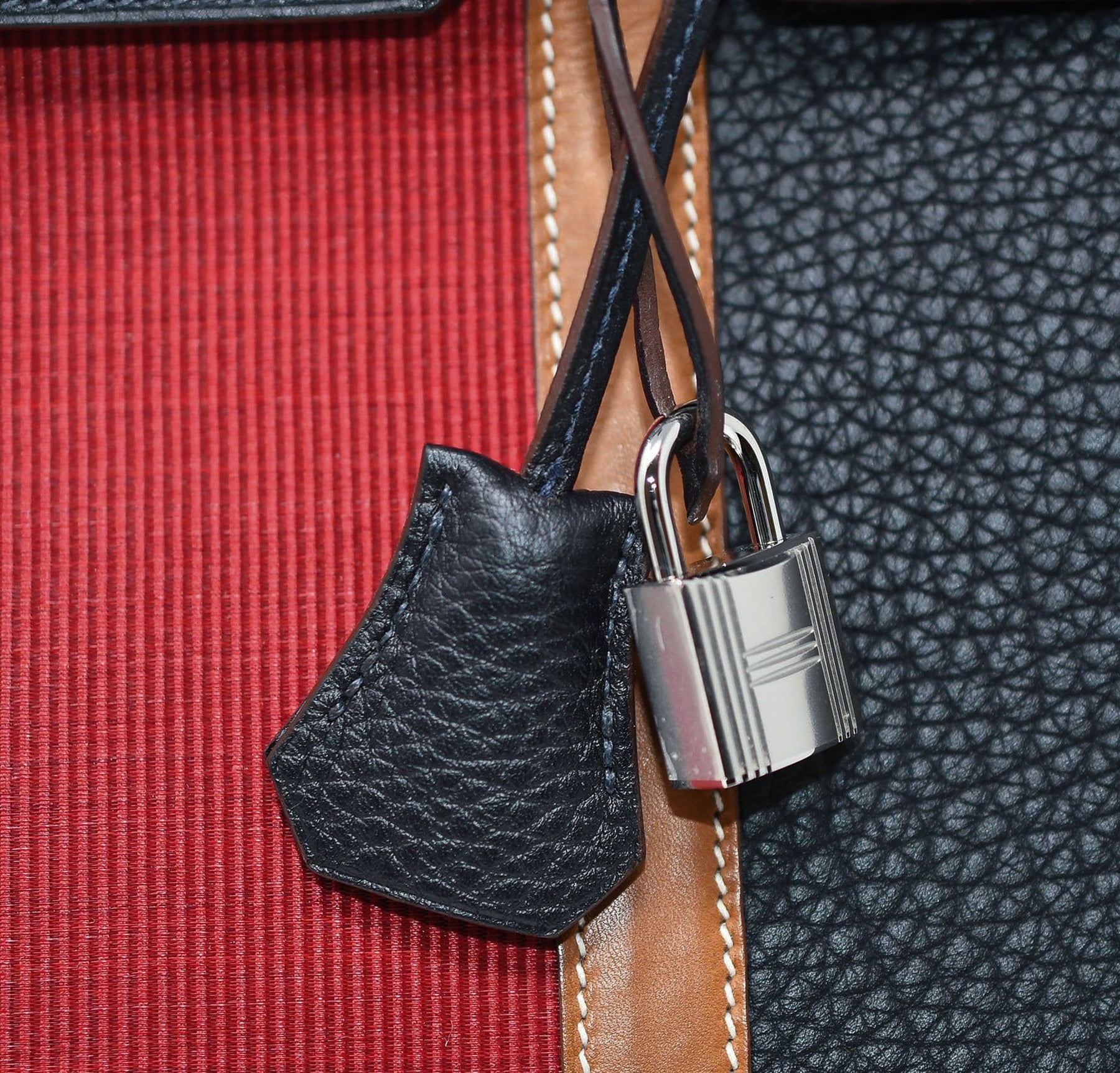Rare in Blue Indigo with Fauve Barenia leather and accentuated with Rouge Crinolin center.