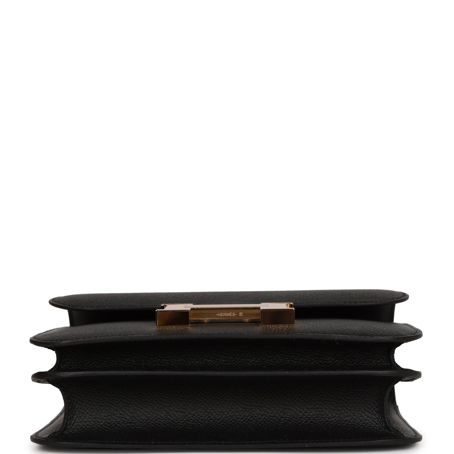 This Constance is in Black epsom leather with gold hardware and has tonal stitching, a metal "H" snap lock closure and adjustable shoulder strap.