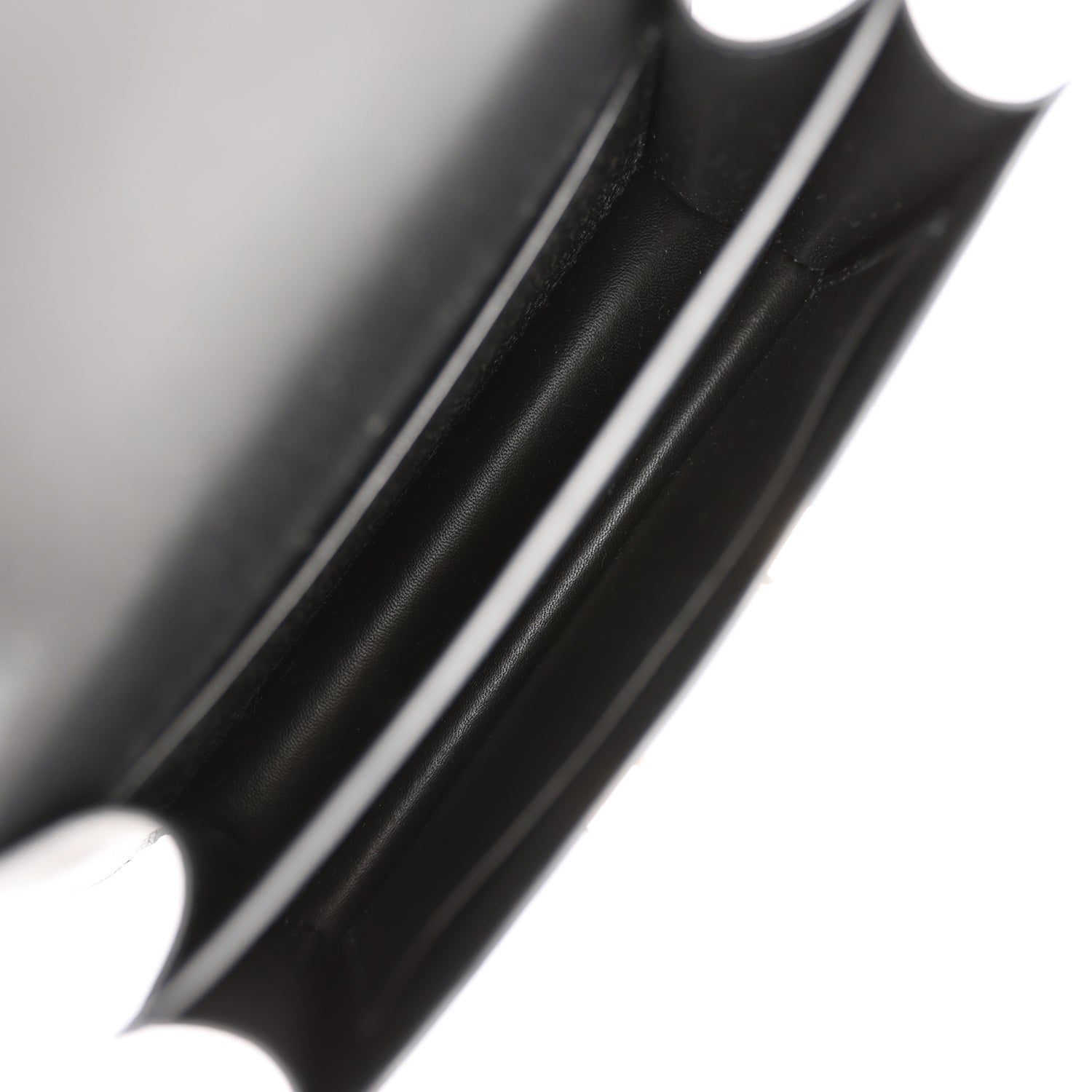 The interior is lined with Black lambskin and has an open pocket on the front wall, a center divide, and a slit pocket on the back wall.