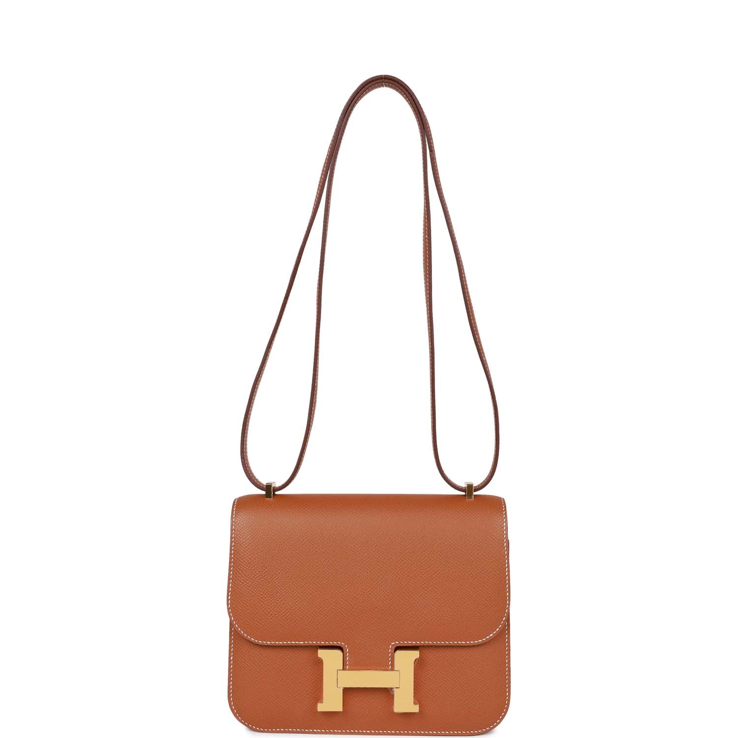 This Constance is in Gold epsom leather with gold hardware and has contrast stitching, a metal "H" snap lock closure and adjustable shoulder strap.