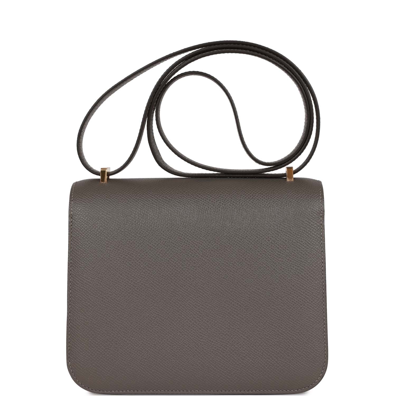 This Constance is in Gris Meyer epsom leather with gold hardware and has tonal stitching, a metal "H" snap lock closure and adjustable shoulder strap.