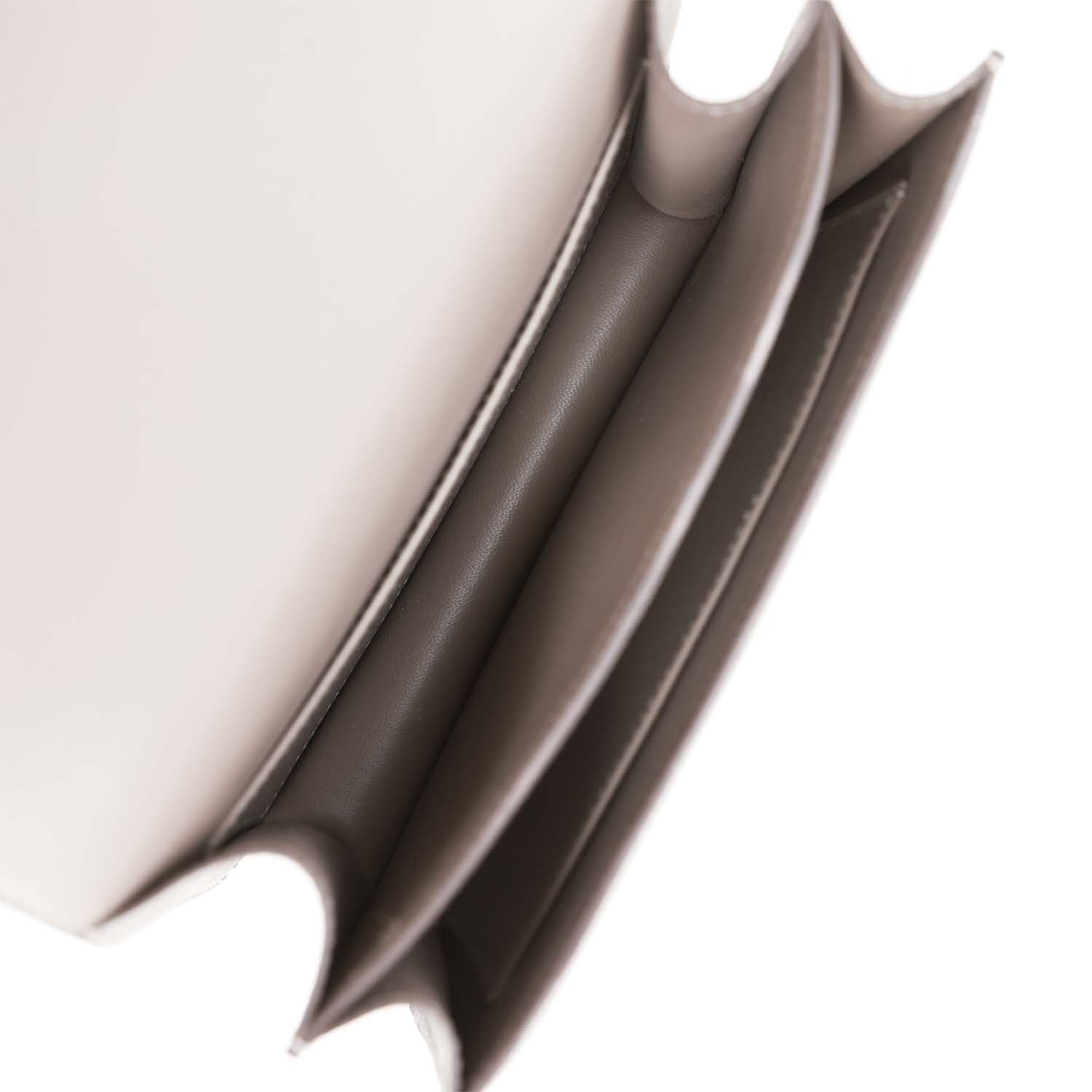 The interior is lined with Gris Meyer lambskin and has an open pocket on the front wall, a center divide, and a slit pocket on the back wall.