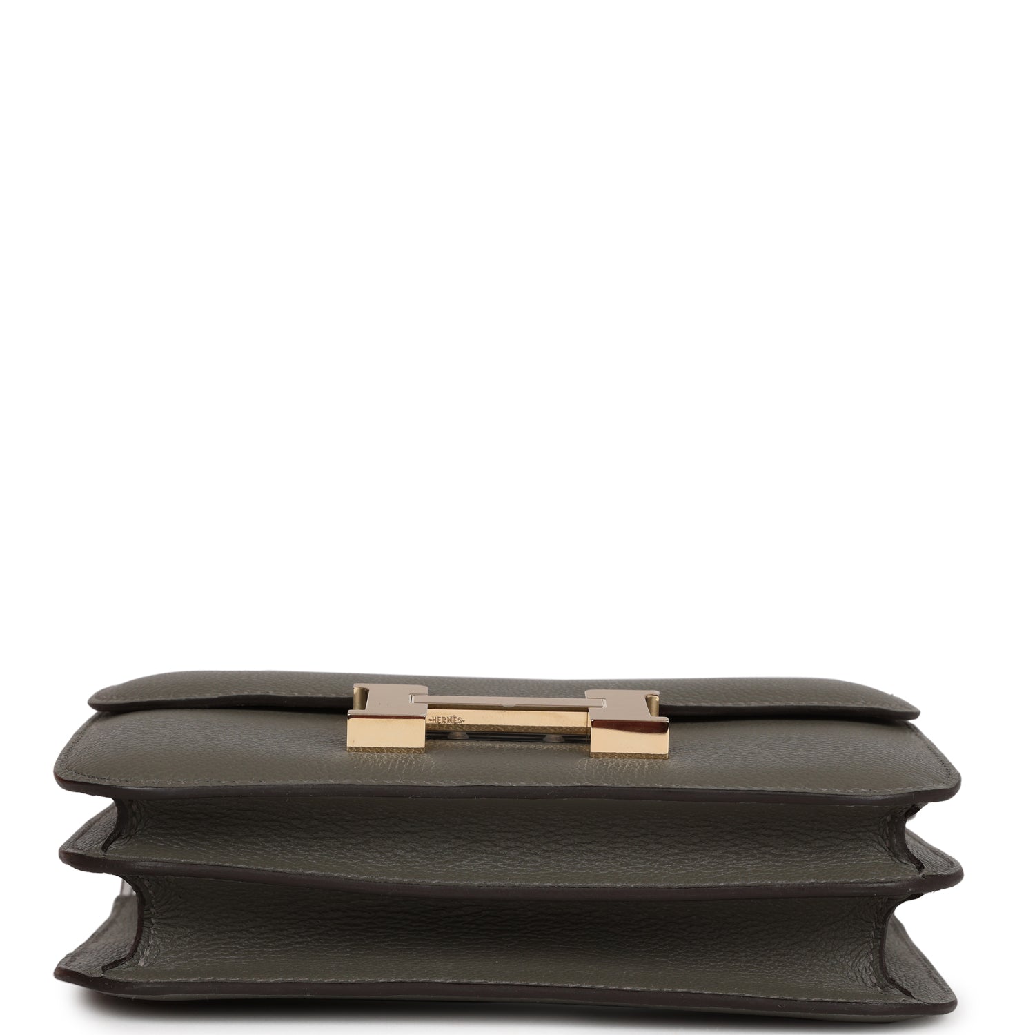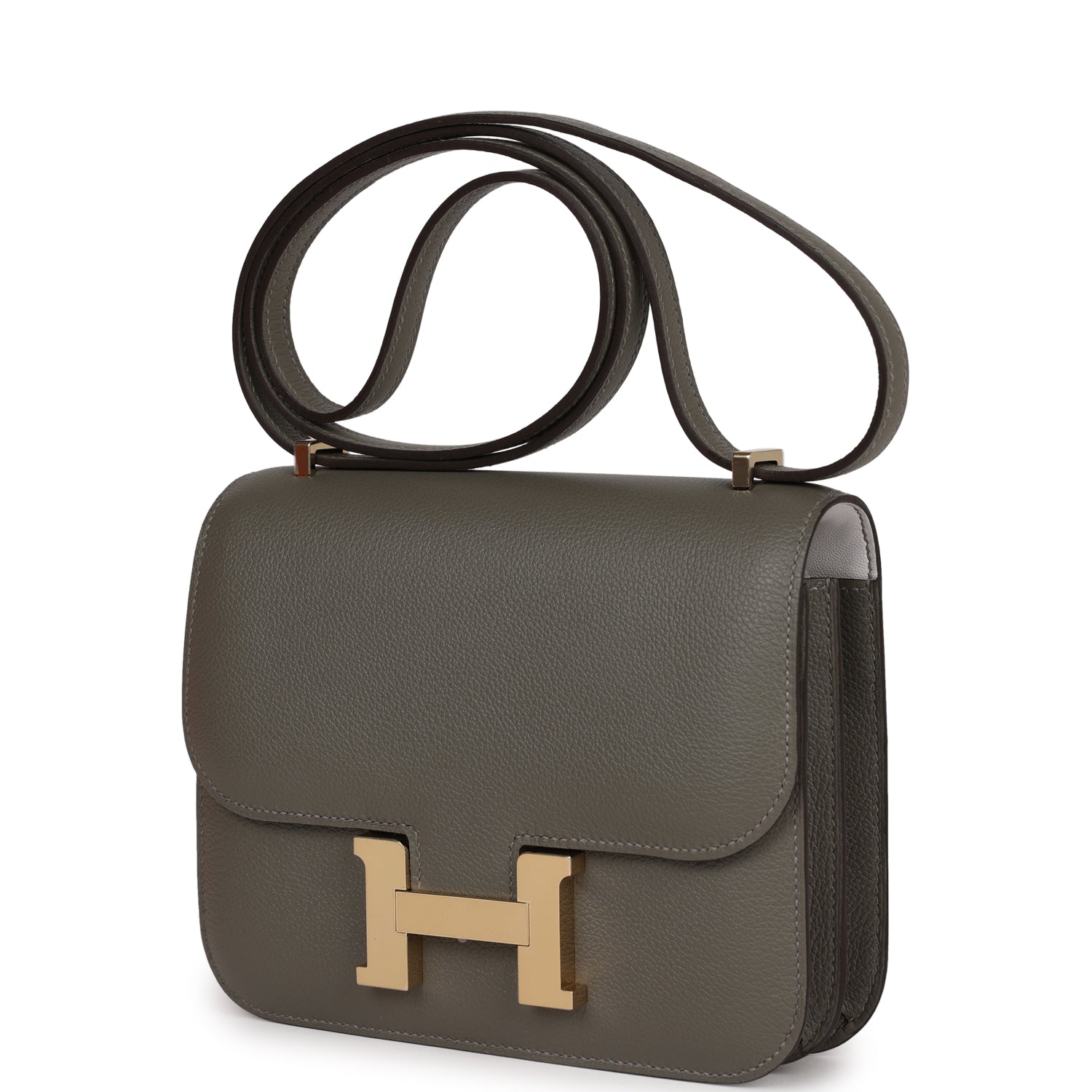 This Constance is a verso in Gris Meyer evercolor leather with permabrass hardware, tonal stitching, a metal "H" snap lock closure and adjustable shoulder strap.