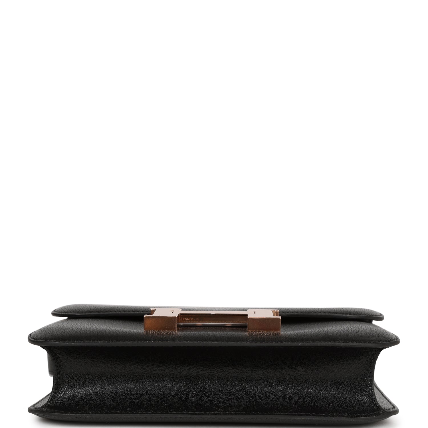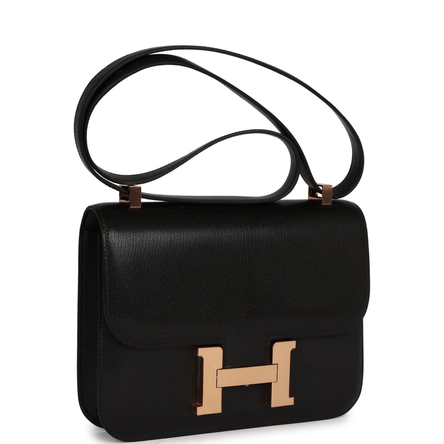 This Constance is in Black Chamkila Chevre with Rose Gold hardware, has tonal stitching, a metal "H" snap lock closure and adjustable shoulder strap.