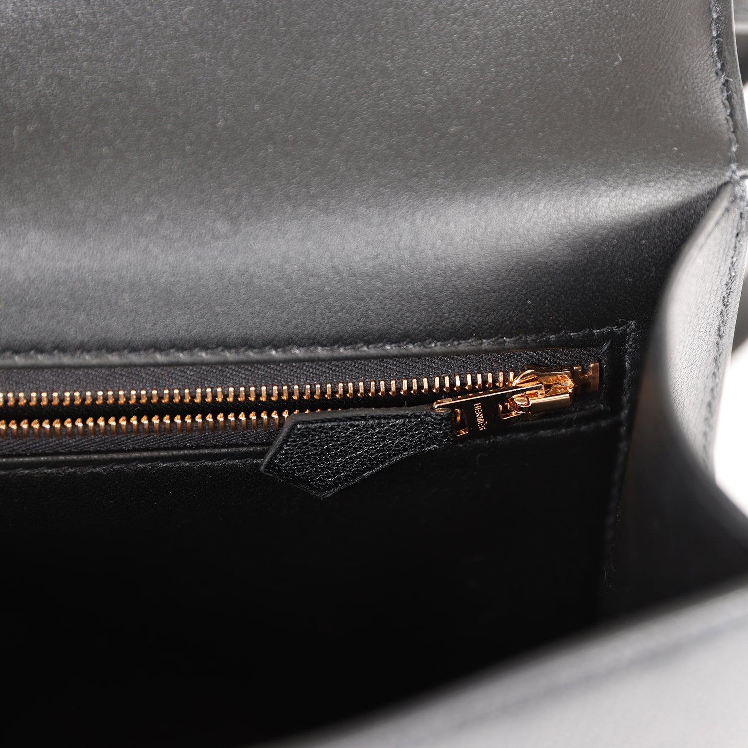 The interior is lined with Black lambskin and has an open pocket on the front wall, a center divide, and a slit pocket on the back wall.