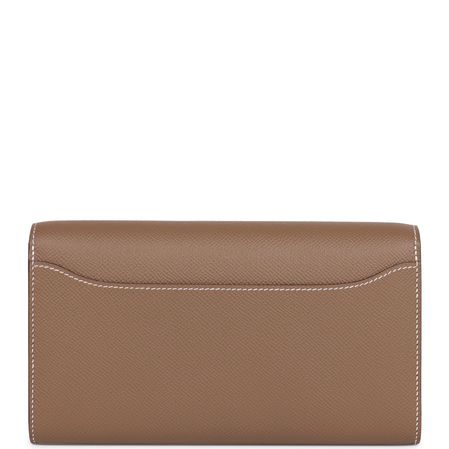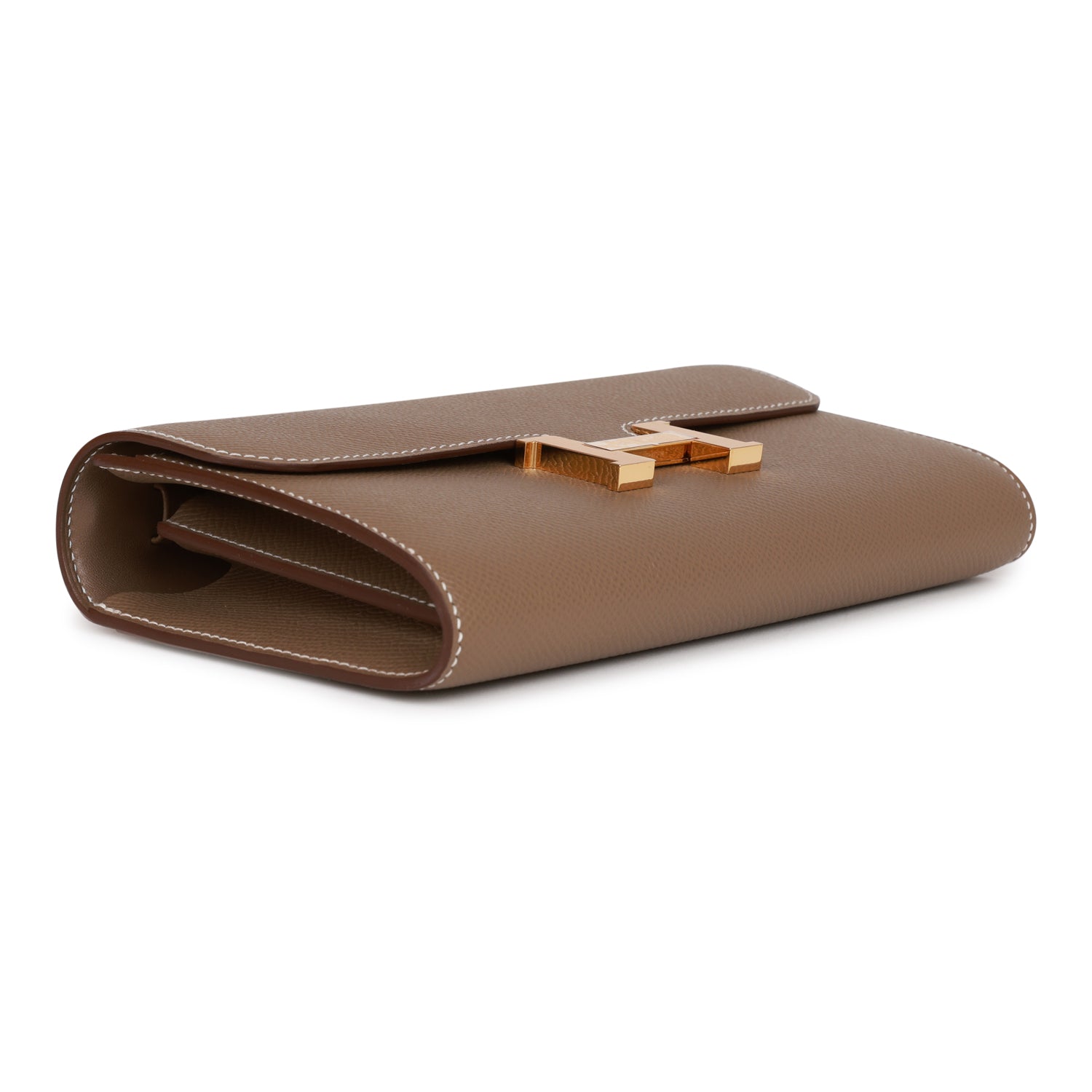This Constance Wallet To Go is in Etoupe epsom leather with gold hardware and has contrast stitching, metal "H" snap lock closure, open front compartment and removable crossbody strap.
