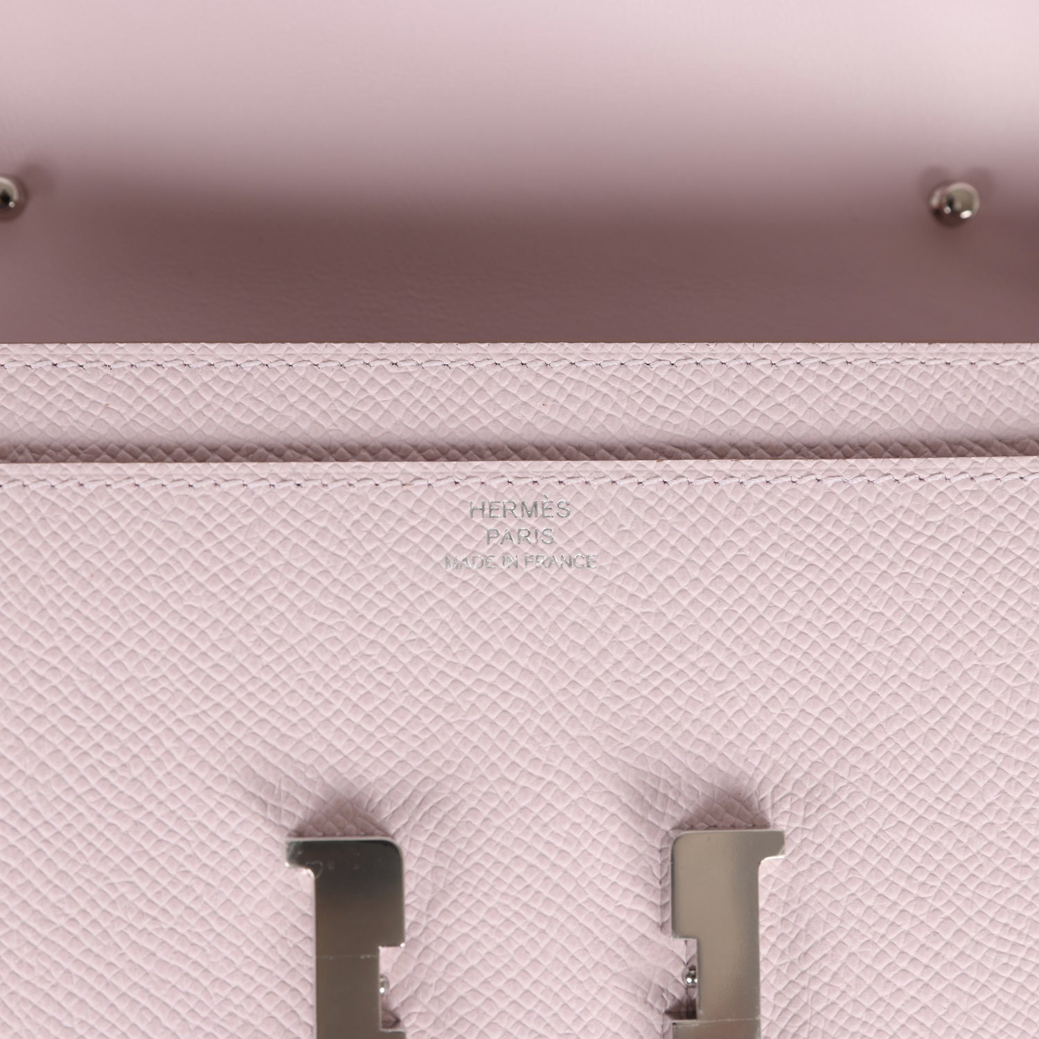 This Constance Wallet To Go is in Mauve Pale epsom leather with palladium hardware and has tonal stitching, metal "H" snap lock closure, open front compartment and removable crossbody strap.