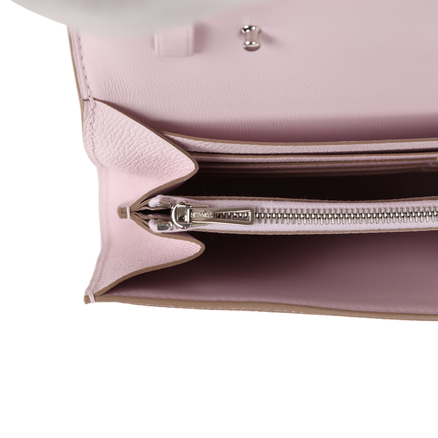 The interior is lined with Mauve Pale epsom leather and two main compartments with six credit card slots and a zippered center compartment with Hermes H lock pull.