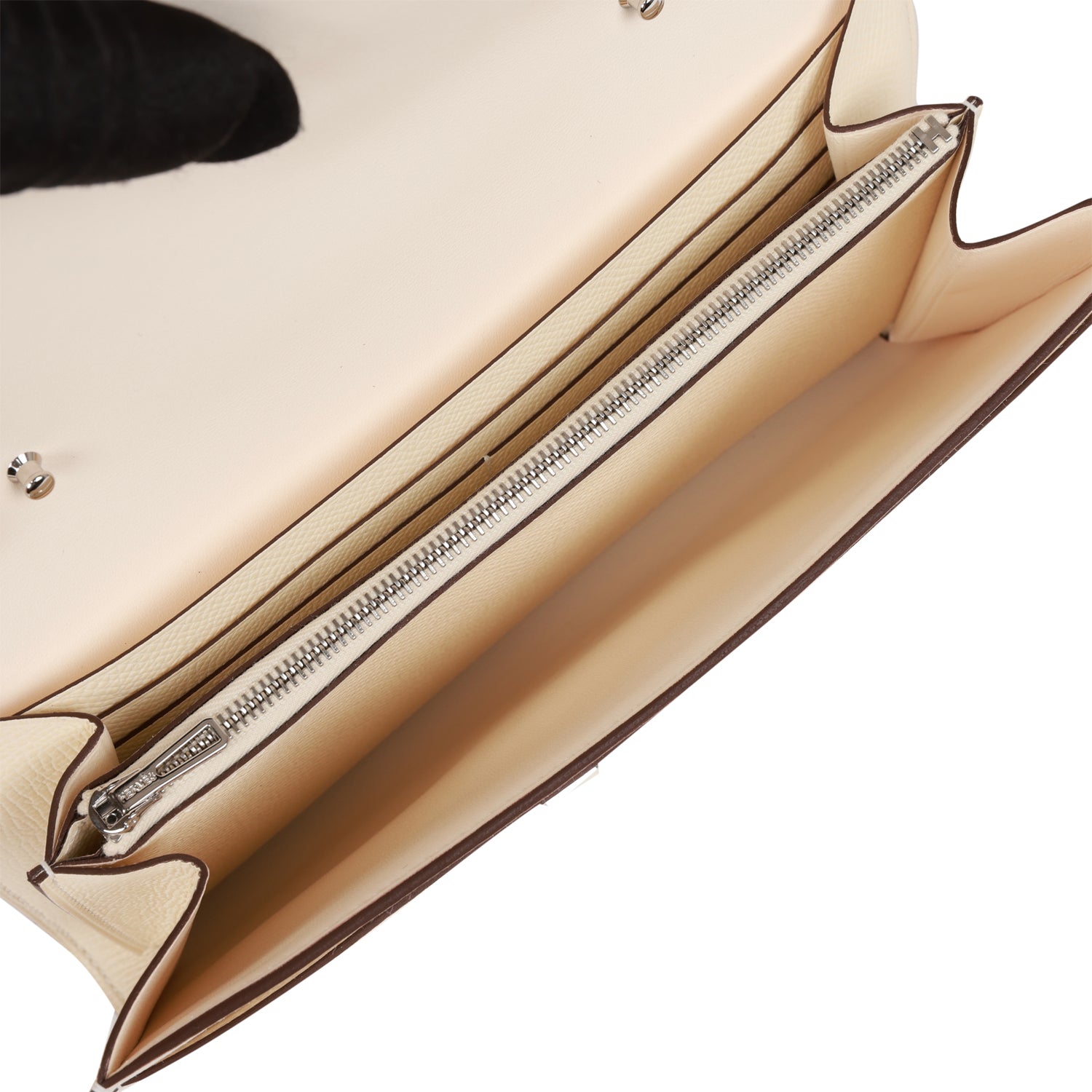 The interior is lined with Nata epsom leather and two main compartments with six credit card slots and a zippered center compartment with Hermes H lock pull.