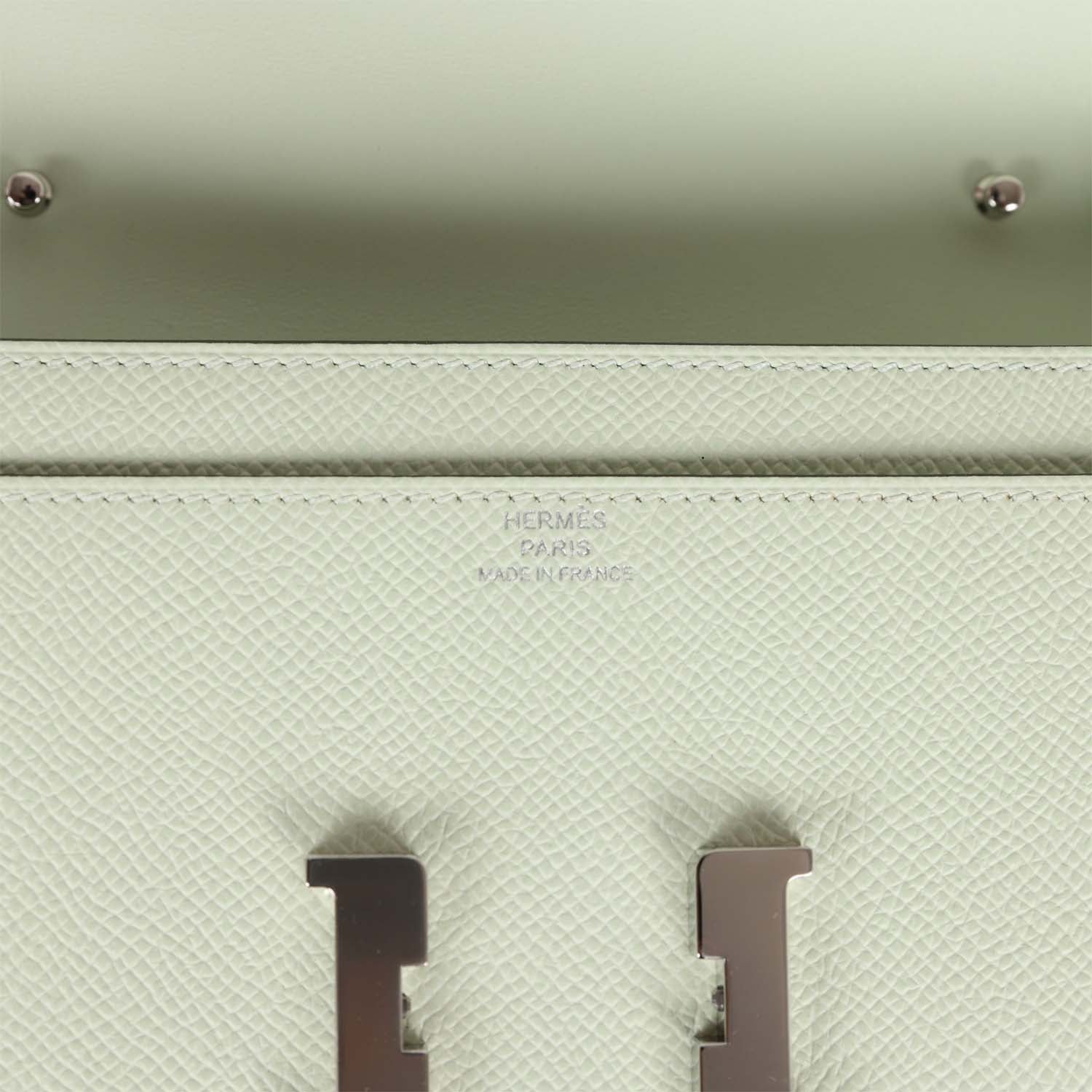 This Constance Wallet To Go is in Vert Fizz epsom leather with palladium hardware and has tonal stitching, metal "H" snap lock closure, open front compartment and removable crossbody strap.