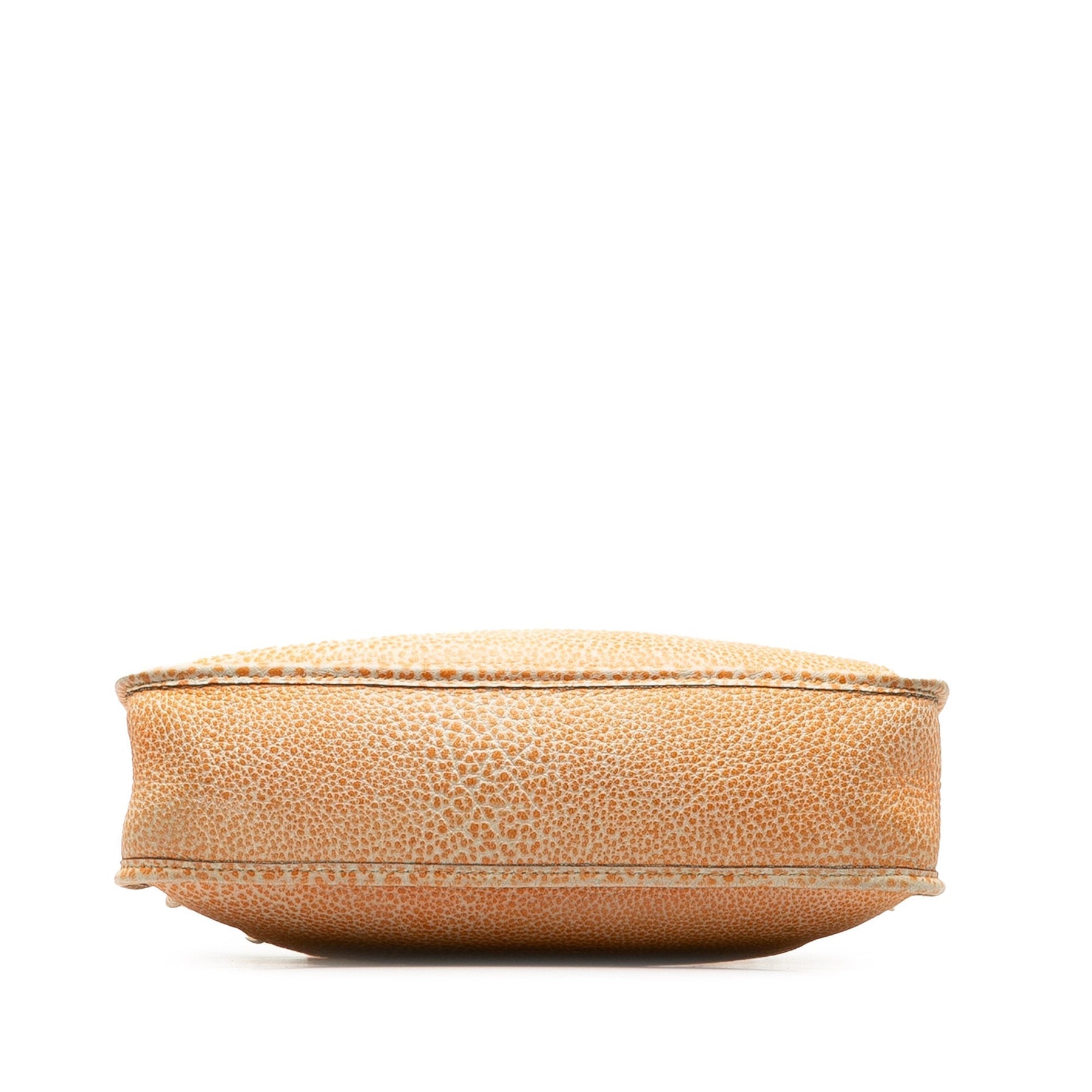 The Evelyne I PM features a leather body, a detachable flat shoulder strap, an open top with a top strap and snap button closure, and an interior slip pocket.