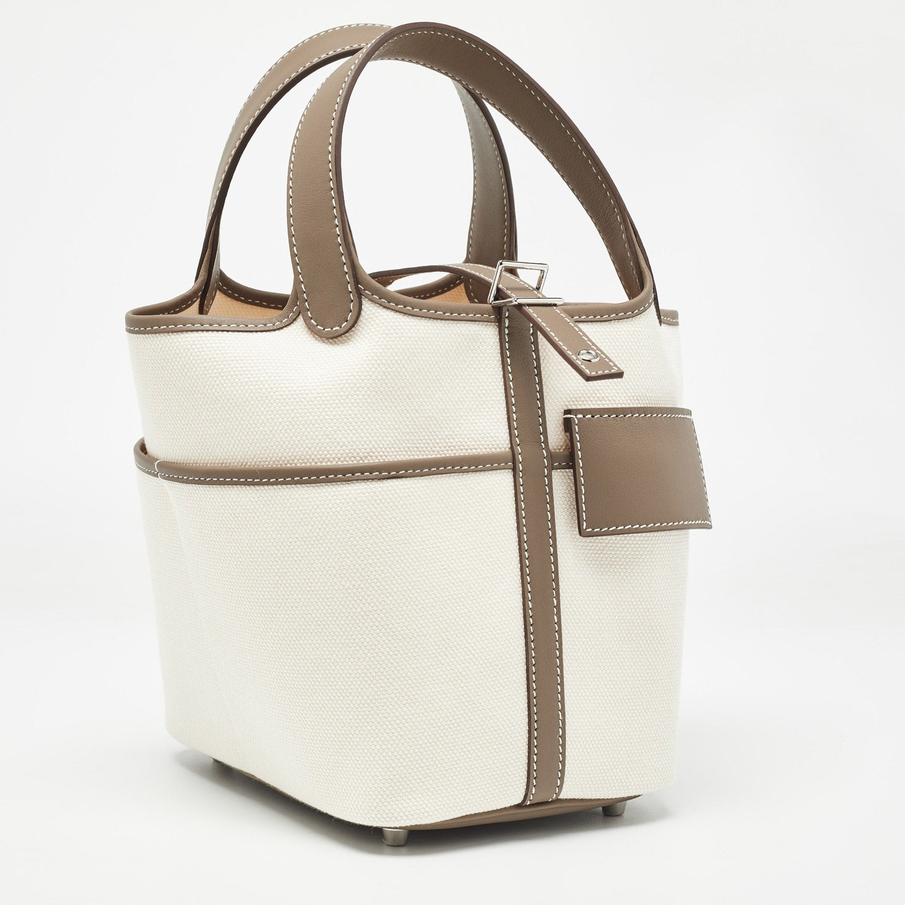 The Hermes Cargo Picotin Lock 18 bag, crafted in a harmonious blend of Ecru/Etoupe Toile and Swift leather, boasts a uniquely structured silhouette. Accented with chic, functional pockets, this exquisite accessory redefines modern luxury with its understated style and impeccable craftsmanship.