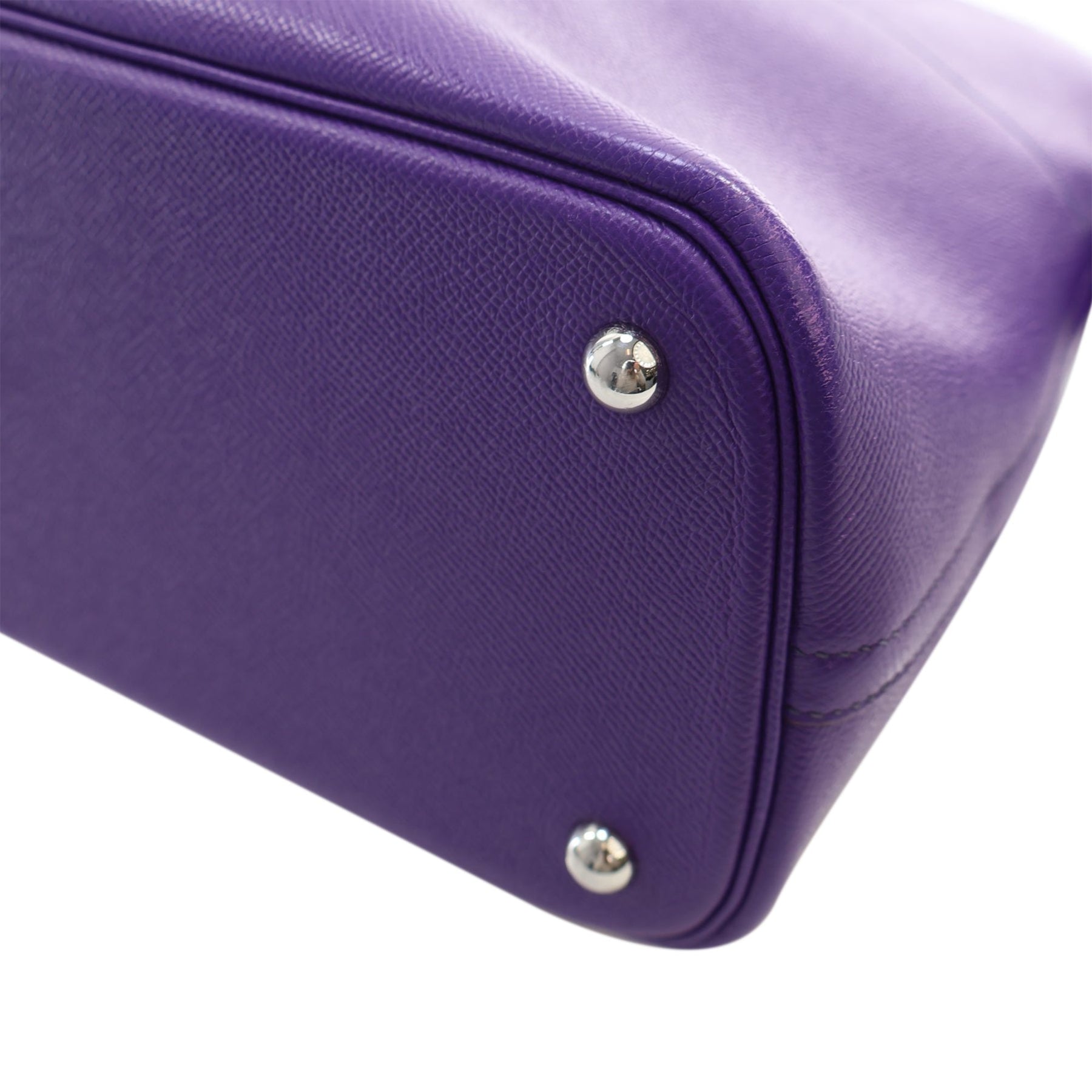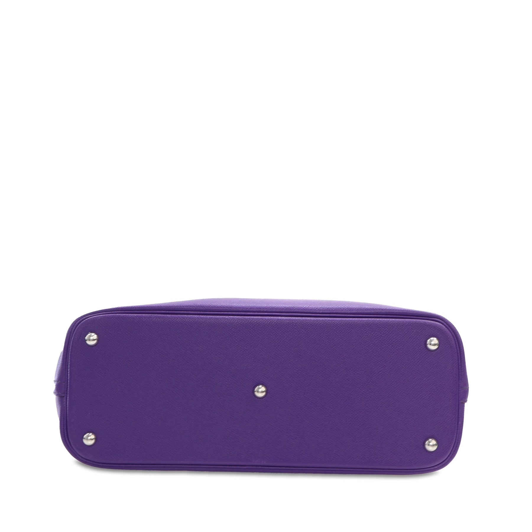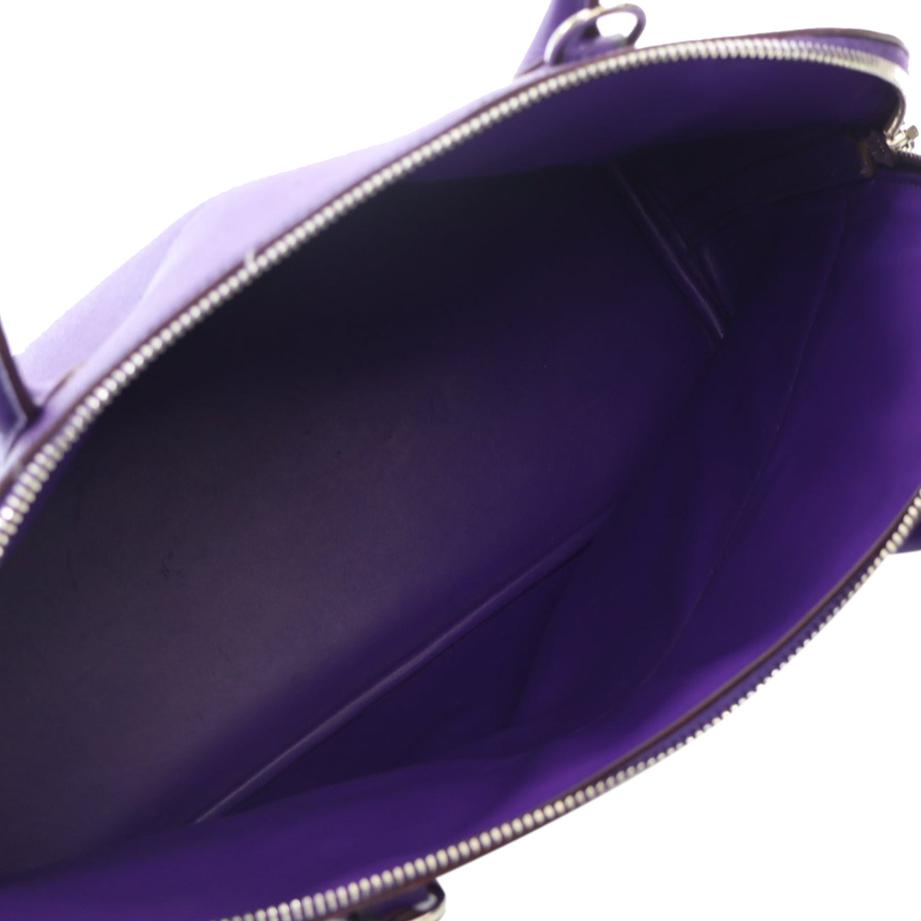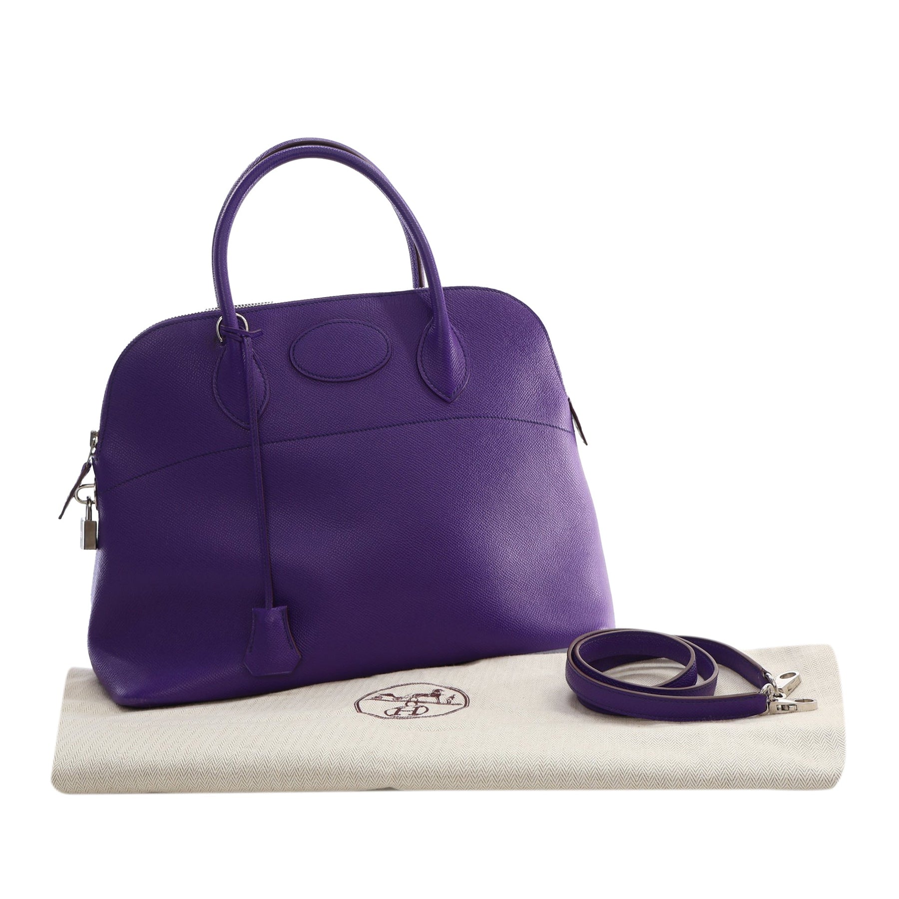 The Bolide 35 features a leather body, rolled leather handles, a detachable flat leather strap, a top zip closure, and an interior slip pocket. Comes with dust bag