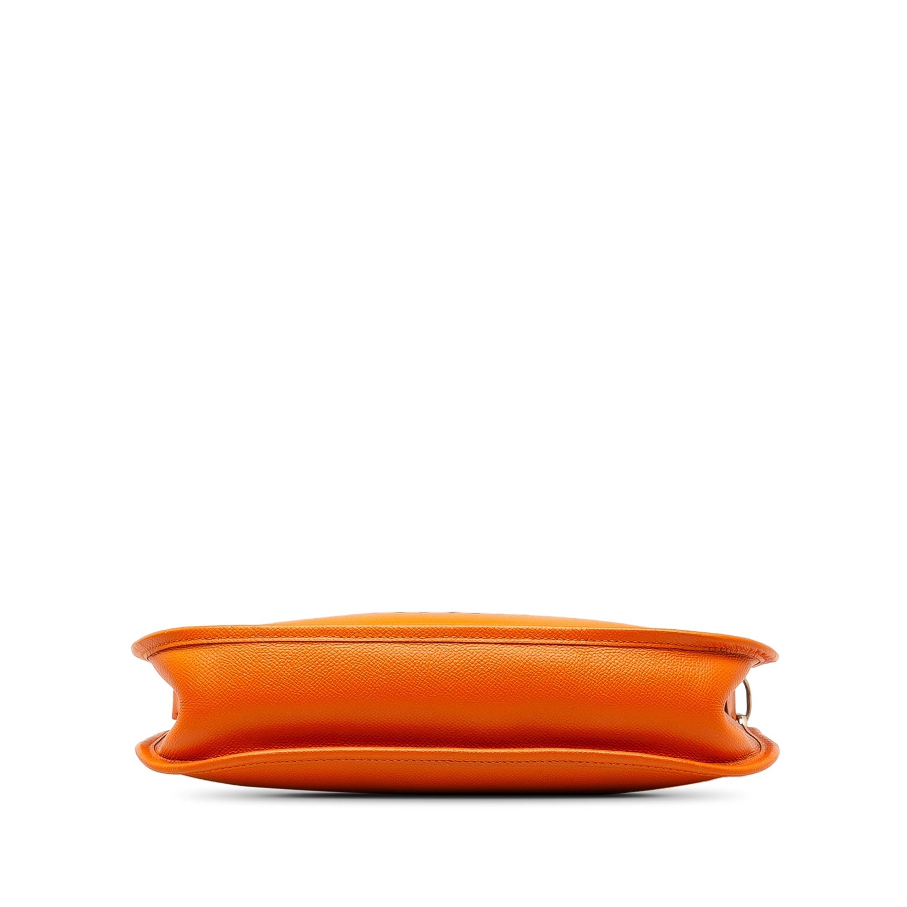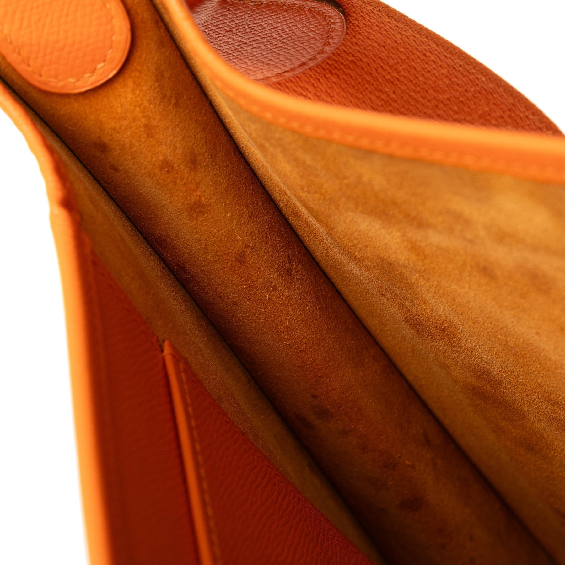 The Evelyne I features a leather body, a removable flat canvas shoulder strap, and an open top with a strap closure.