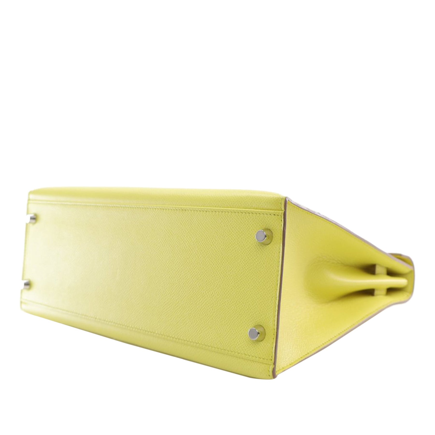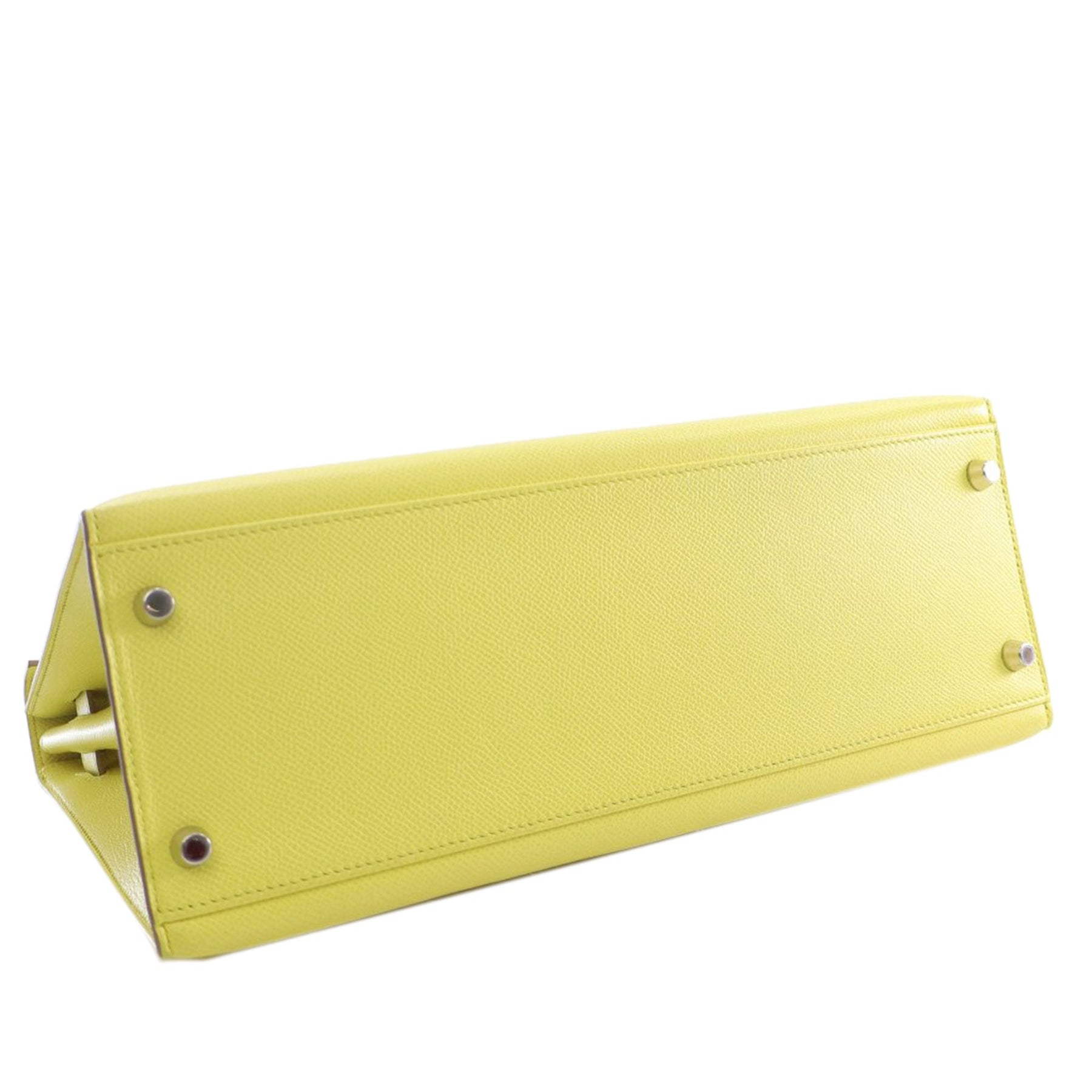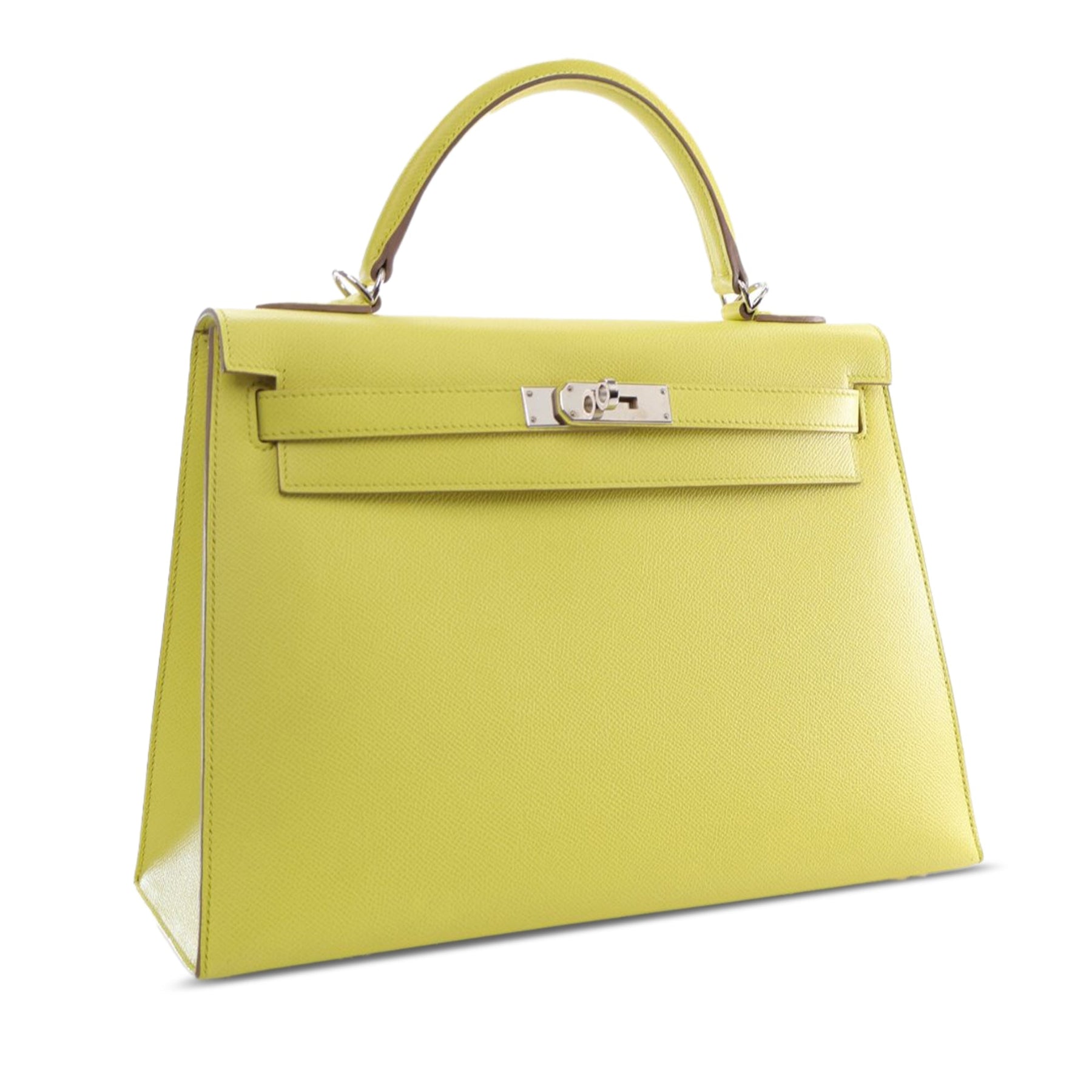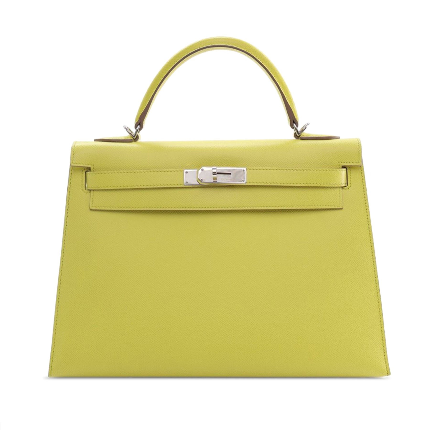 The Kelly 32 features an epsom leather body in Soufre color, a rolled leather top handle, a detachable flat leather shoulder strap, a flap with turn lock and pull through closure, and interior zip and slip pockets. Comes with dust bag