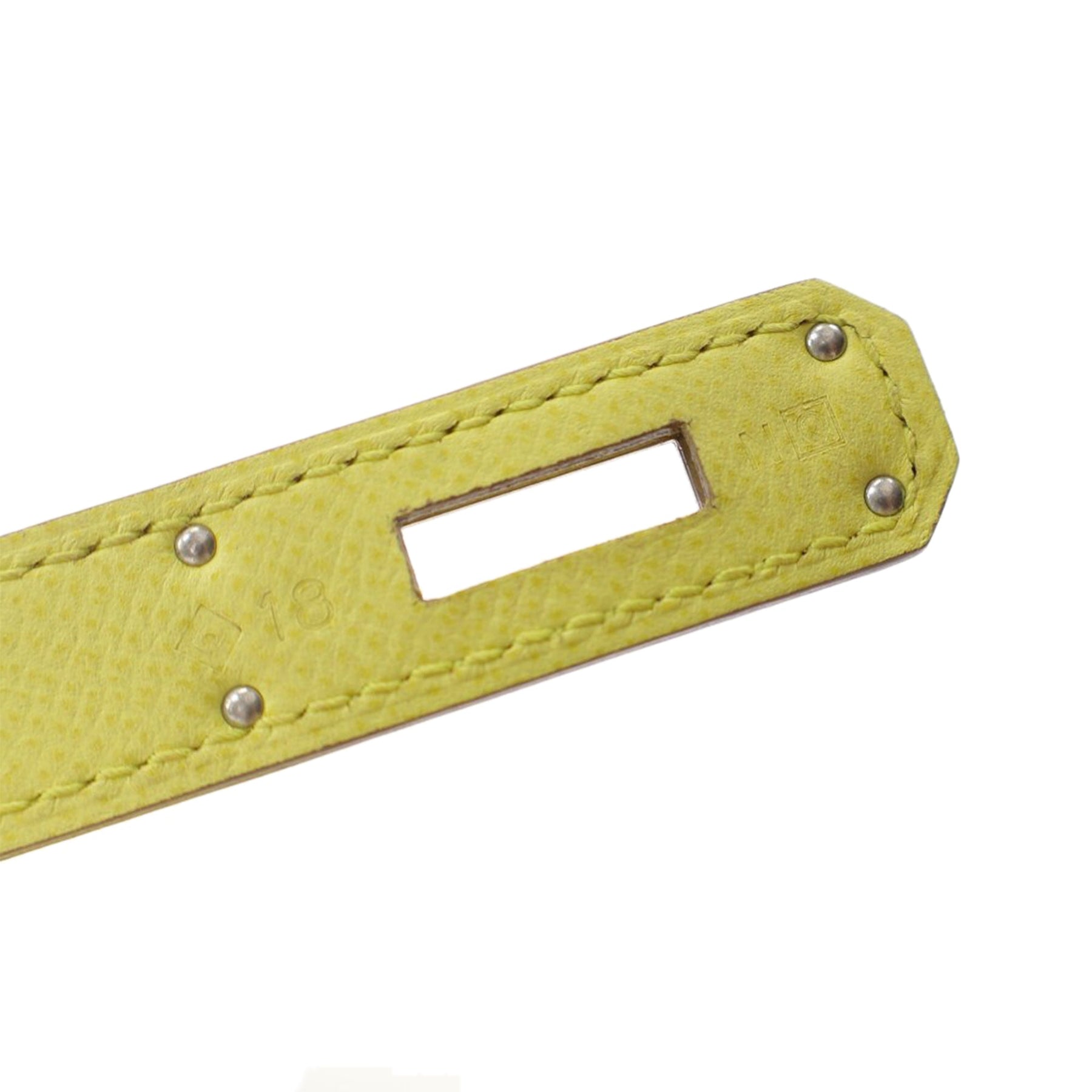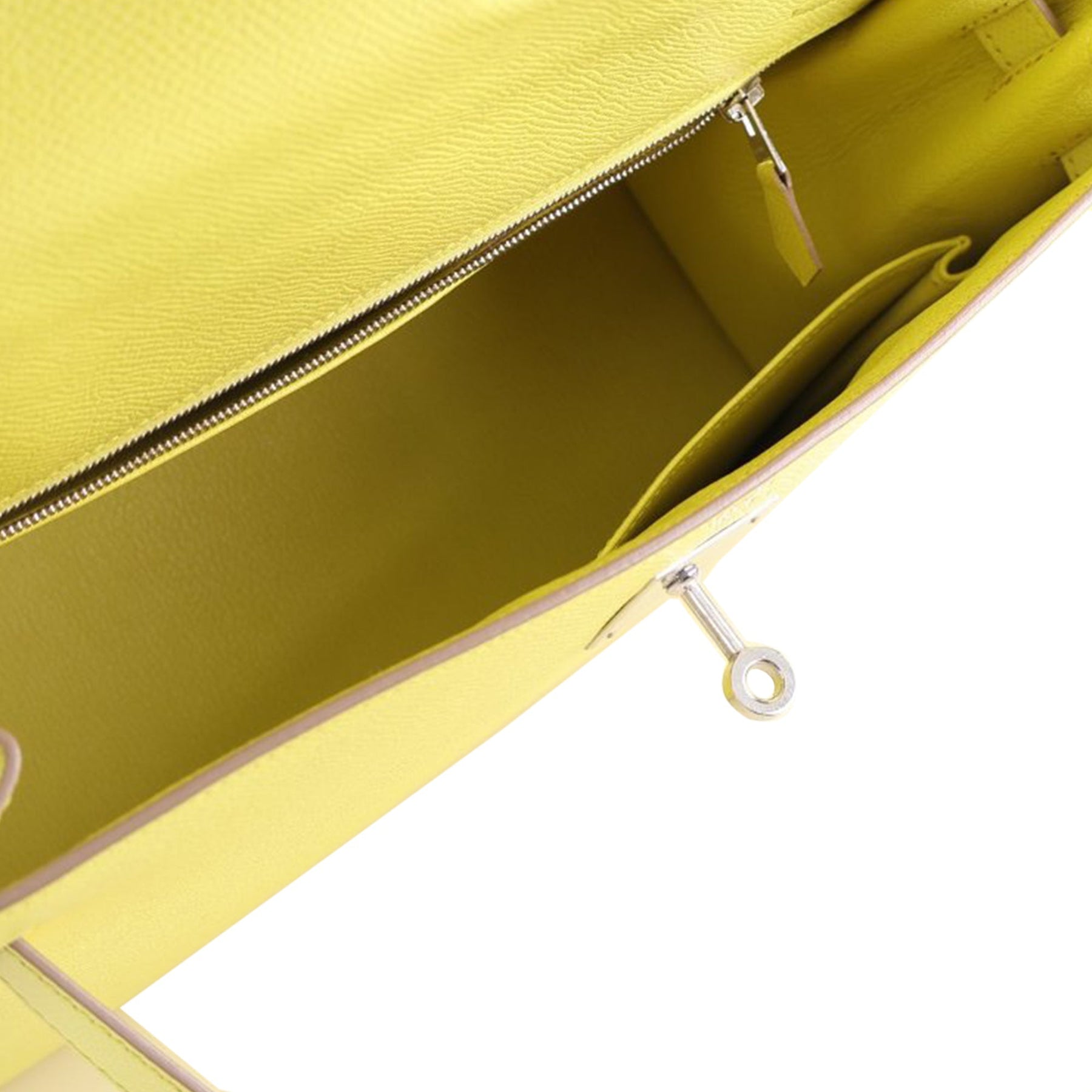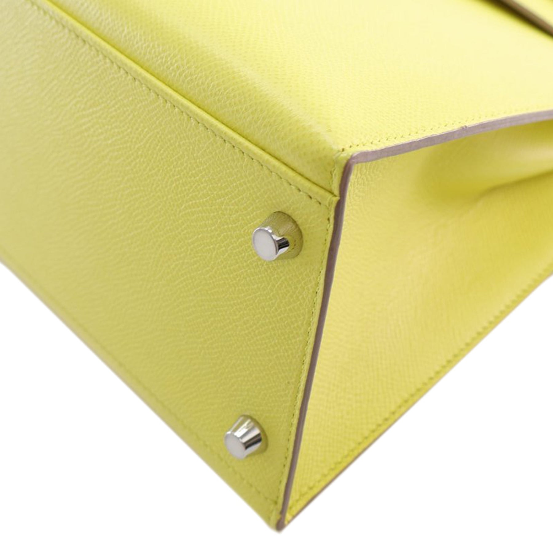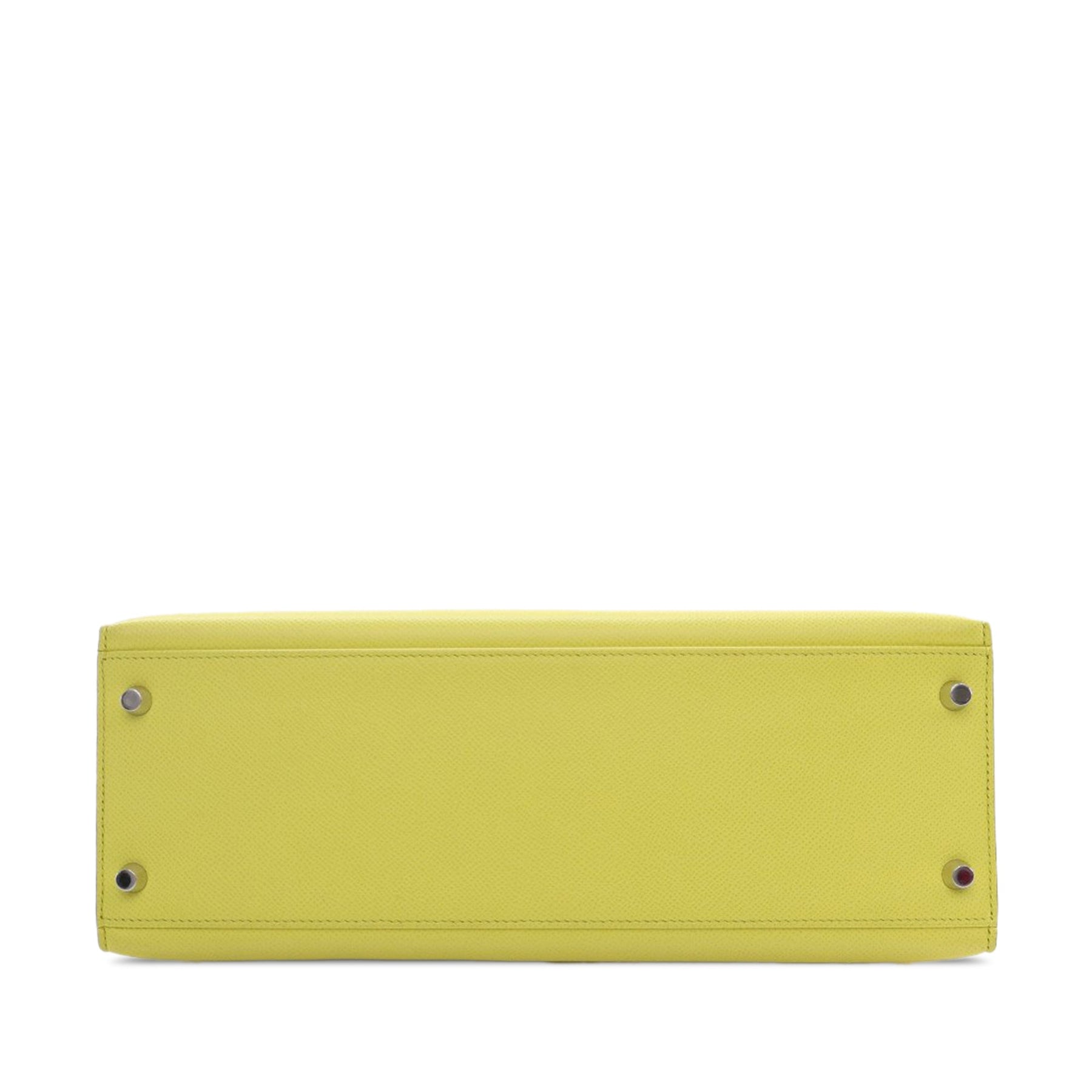 The Kelly 32 features an epsom leather body in Soufre color, a rolled leather top handle, a detachable flat leather shoulder strap, a flap with turn lock and pull through closure, and interior zip and slip pockets. Comes with dust bag