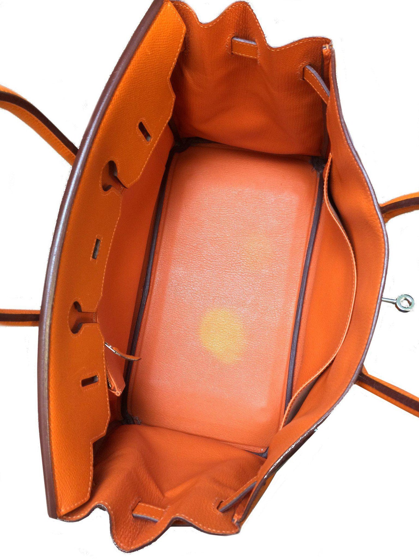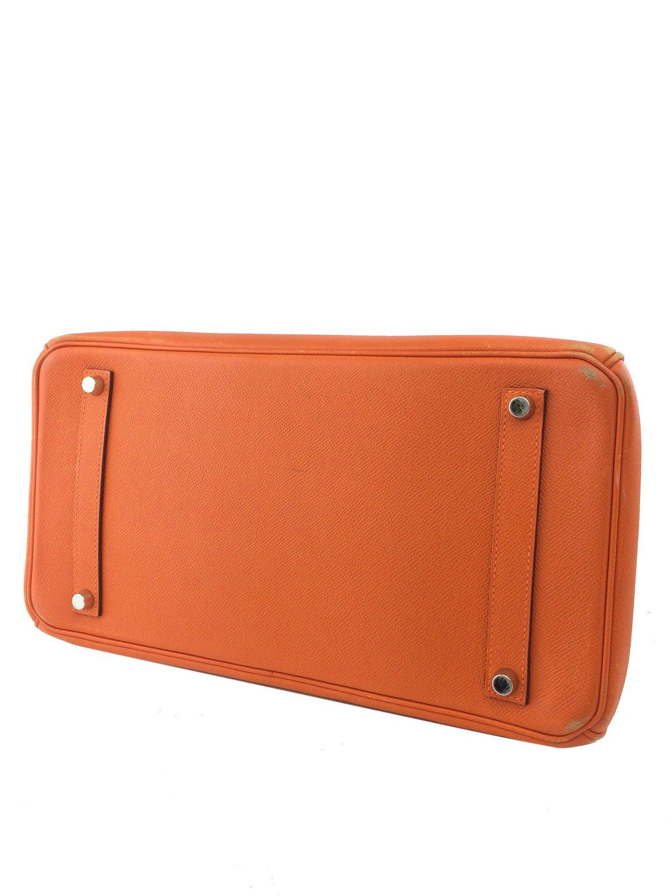 We the ity of this Hermes Epsom Leather Birkin 35 Bag crafted in orange Epsom leather. This highly sought-after and nearly impossible to find collectors piece takes 18 hours to construct by a single highly skilled trained craftsman. This bag is an investment piece, meaning it will either hold or go up in value over time. This timeless handbag features palladium hardware, including protective metal feet and rolled leather top handles. The frontal flap is secured with a turn-lock closure that opens to a matching leather interior lining with zipper and patch pockets.