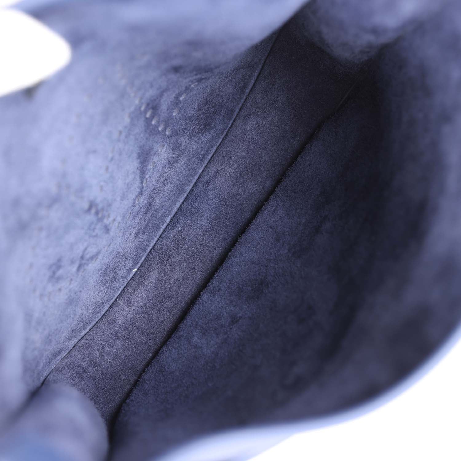 This Evelyne is in Bleu Saphir clemence leather with gold hardware and has tonal stitching, pull tab top closure and a removable canvas and leather shoulder/crossbody strap.