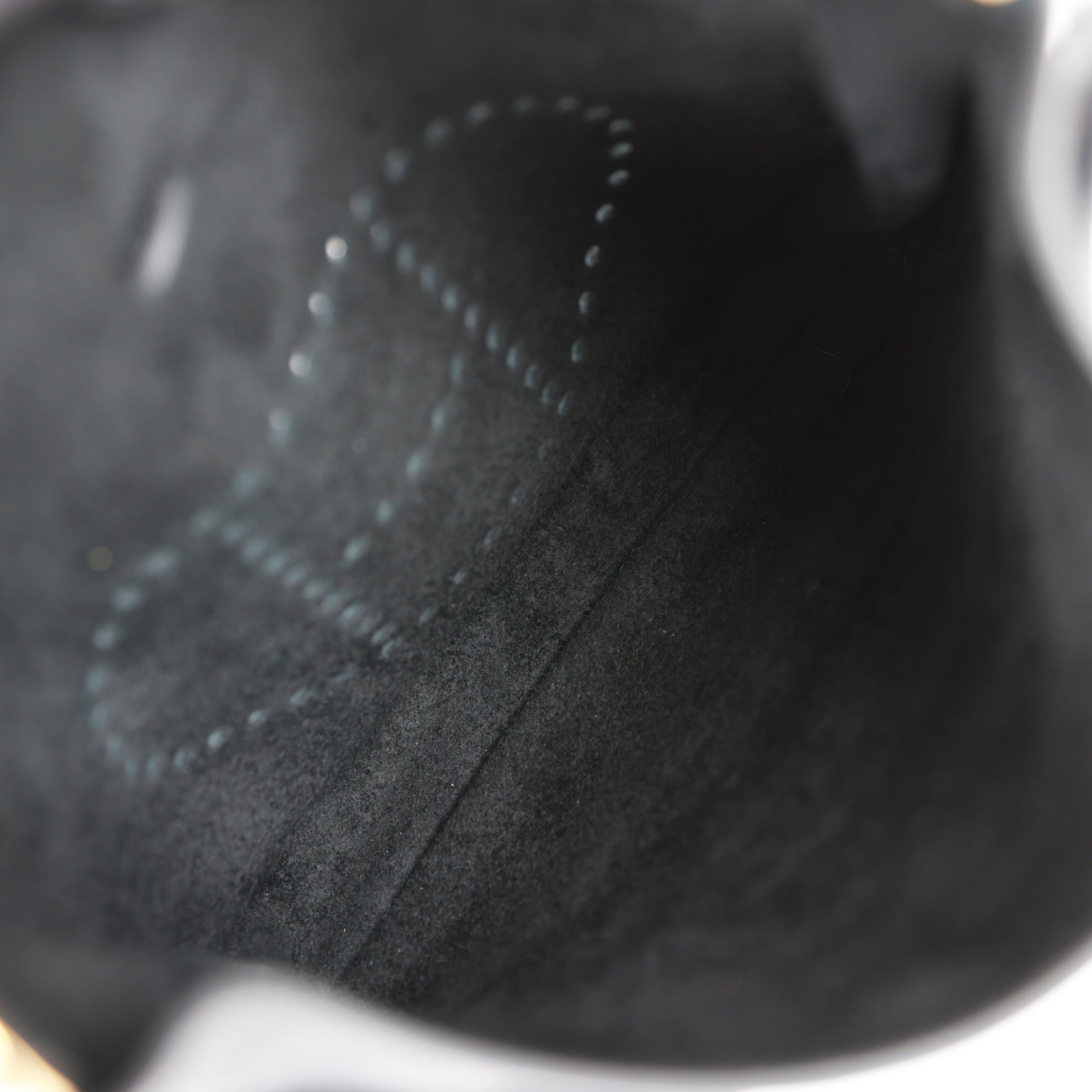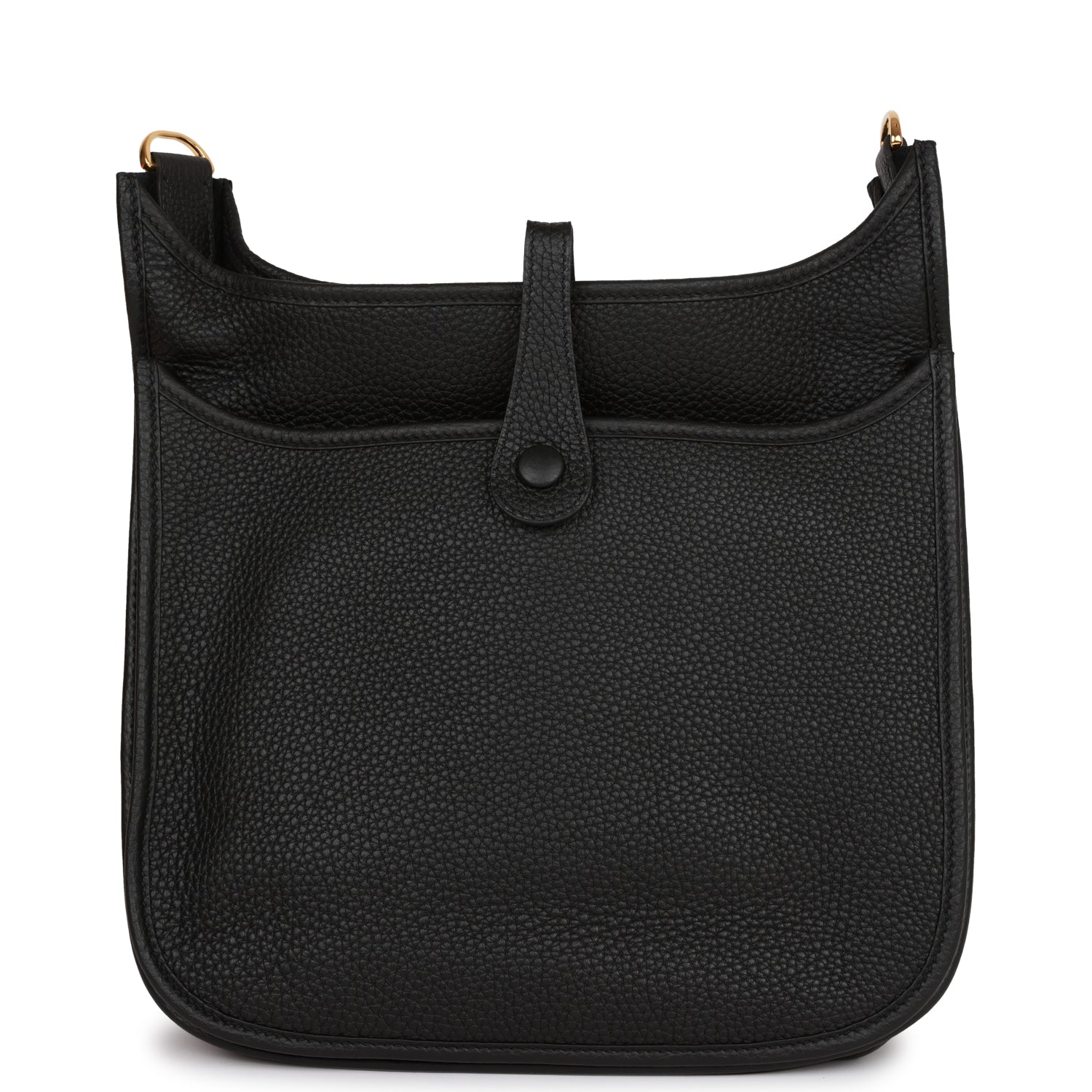 This Evelyne is in Black clemence leather with gold hardware and has tonal stitching, pull tab top closure and black removable canvas and leather shoulder/crossbody strap.