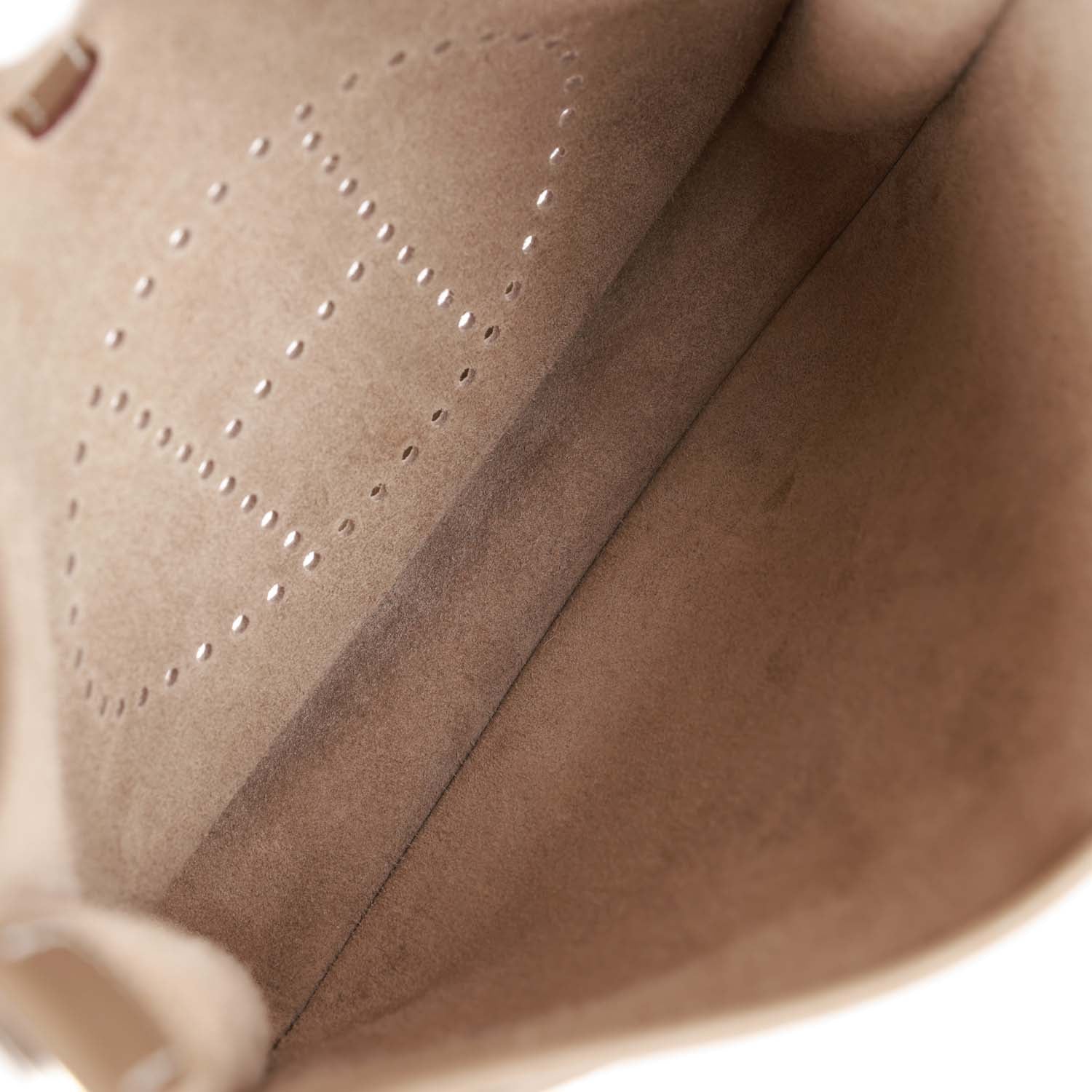 This Evelyne is in Etoupe clemence leather with palladium hardware, has contrast stitching, pull tab closure, and an Etoupe removable canvas and leather shoulder/crossbody strap.